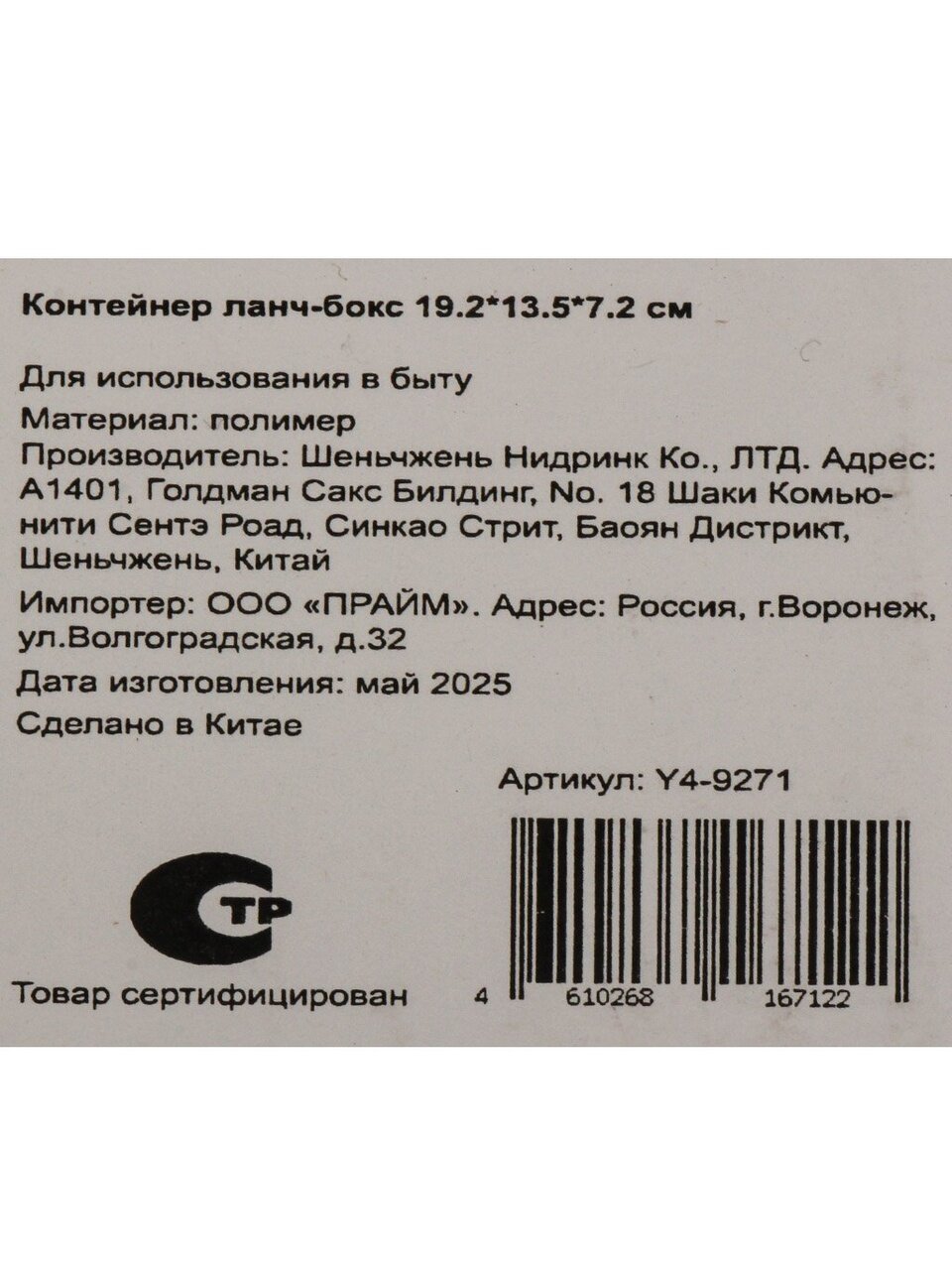 Контейнер-ланчбокс Y4-9271 — оптимальный выбор для тех, кто ищет недорогой и функциональный контейнер для еды с отделениями. Его удобно использовать для обеда в офисе, школьных перекусов, пикников или хранения продуктов на даче. Пластиковый корпус не содержит эмалированного покрытия, подходит для разогрева в микроволновке и легко моется. Благодаря защёлке крышка плотно фиксируется, предотвращая протекание.