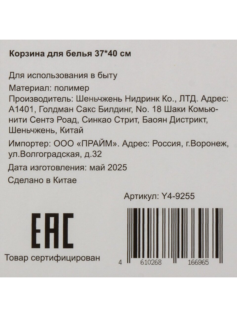 Какой размер у корзины для белья Y4-9255?