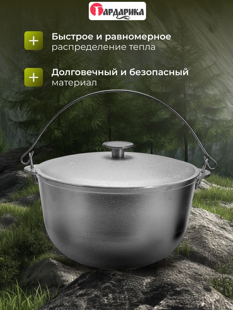 - Удобная ручка облегчает переноску казана и позволяет подвесить его над костром для приготовления пищи на открытом воздухе.