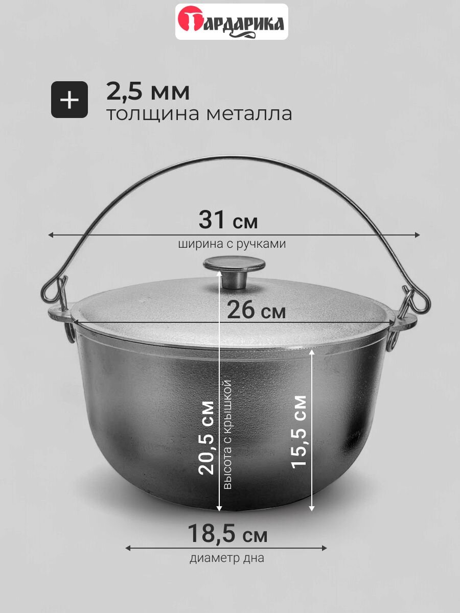 Взять с собой алюминиевый казан в поход намного удобнее и легче, чем тяжелую посуду из чугуна. Котелок Гардарика идеален для приготовления пищи на охоте, рыбалке и в лесу. Он пригоден как для профессионального, так и для индивидуального использования. Корпус котла с плоским дном позволяет использовать его как в походных, так и в домашних условиях на газовых и электрических плитах.