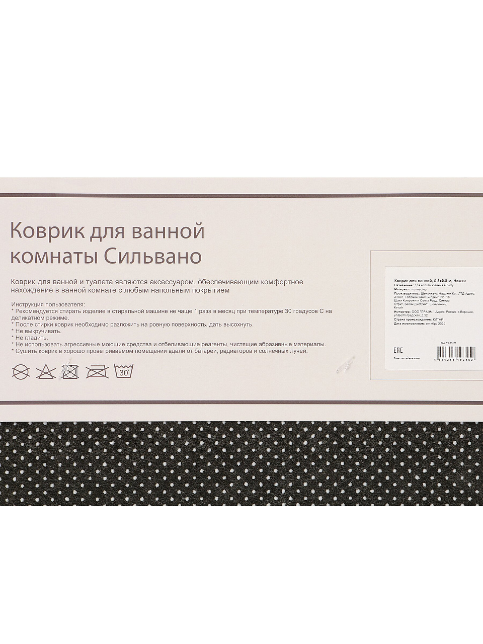 Коврик выполнен из полиэстера — это прочное волокно, устойчивое к износу и многократным стиркам. Нетканая основа сохраняет форму даже при интенсивном использовании.