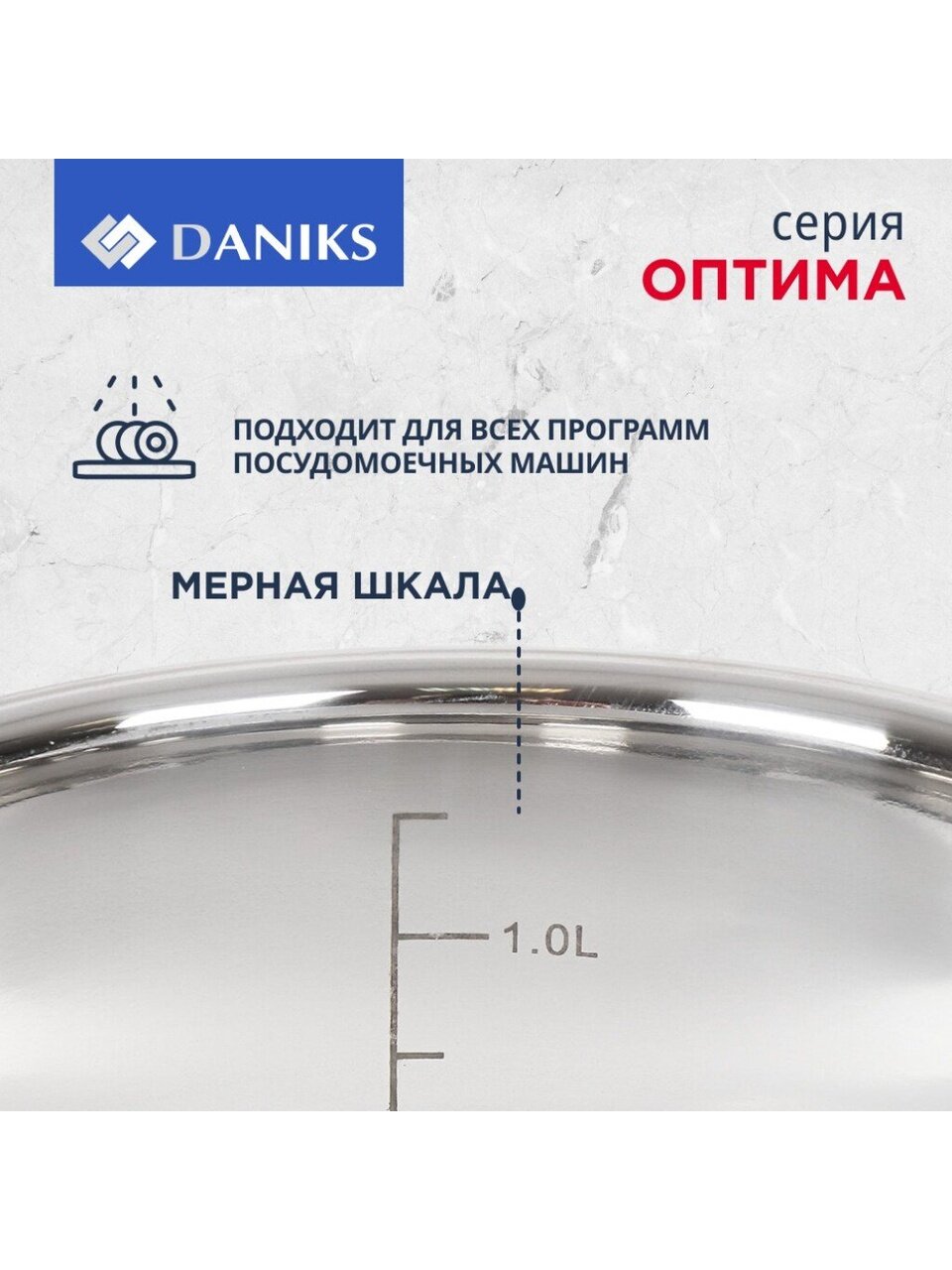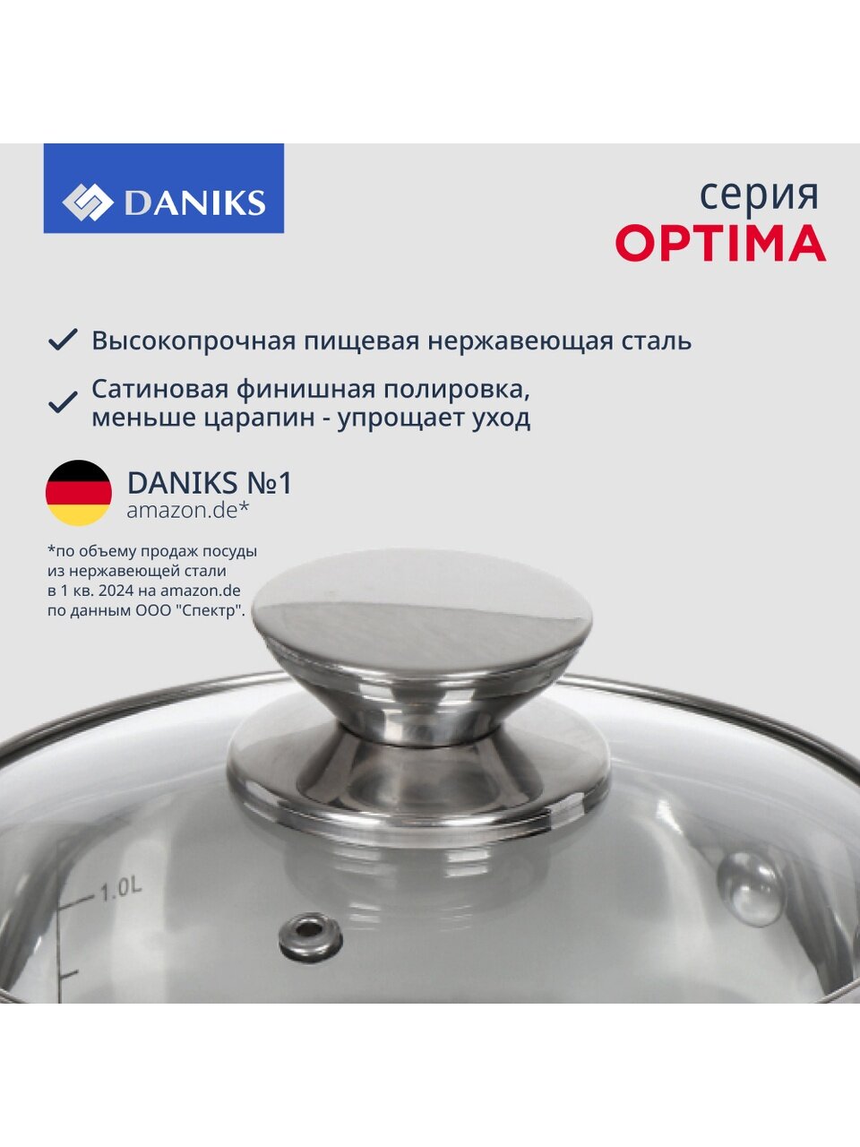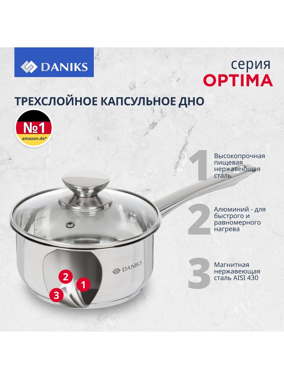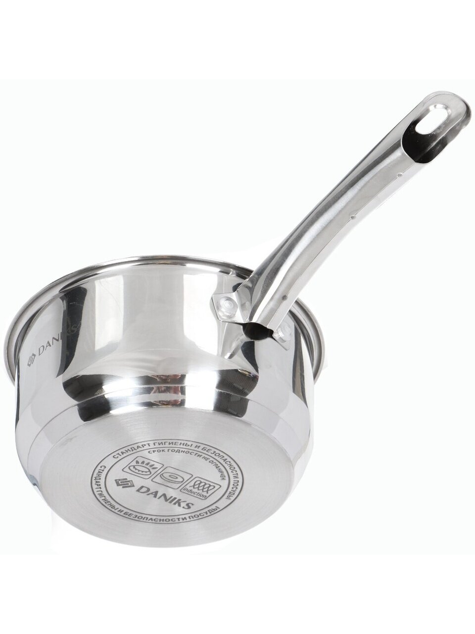 Ковшик посуды Daniks Оптима выполнен из высококачественной нержавеющей стали. Крышка из прозрачного стекла позволяют контролировать процесс приготовления пищи. Металлическая ручка прикреплена к корпусу методом клепочной фиксации, удобна, прочна и не нагревается при использовании посуды.