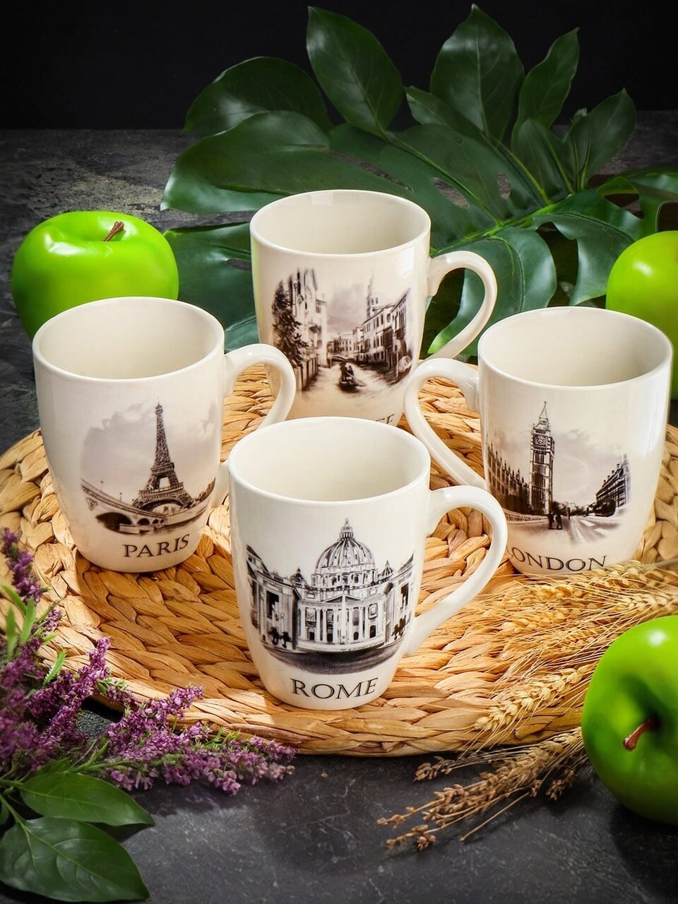 Объём каждой кружки 350 мл, общий вес набора — 1340 г. Кружки подходят для горячих и холодных напитков.
