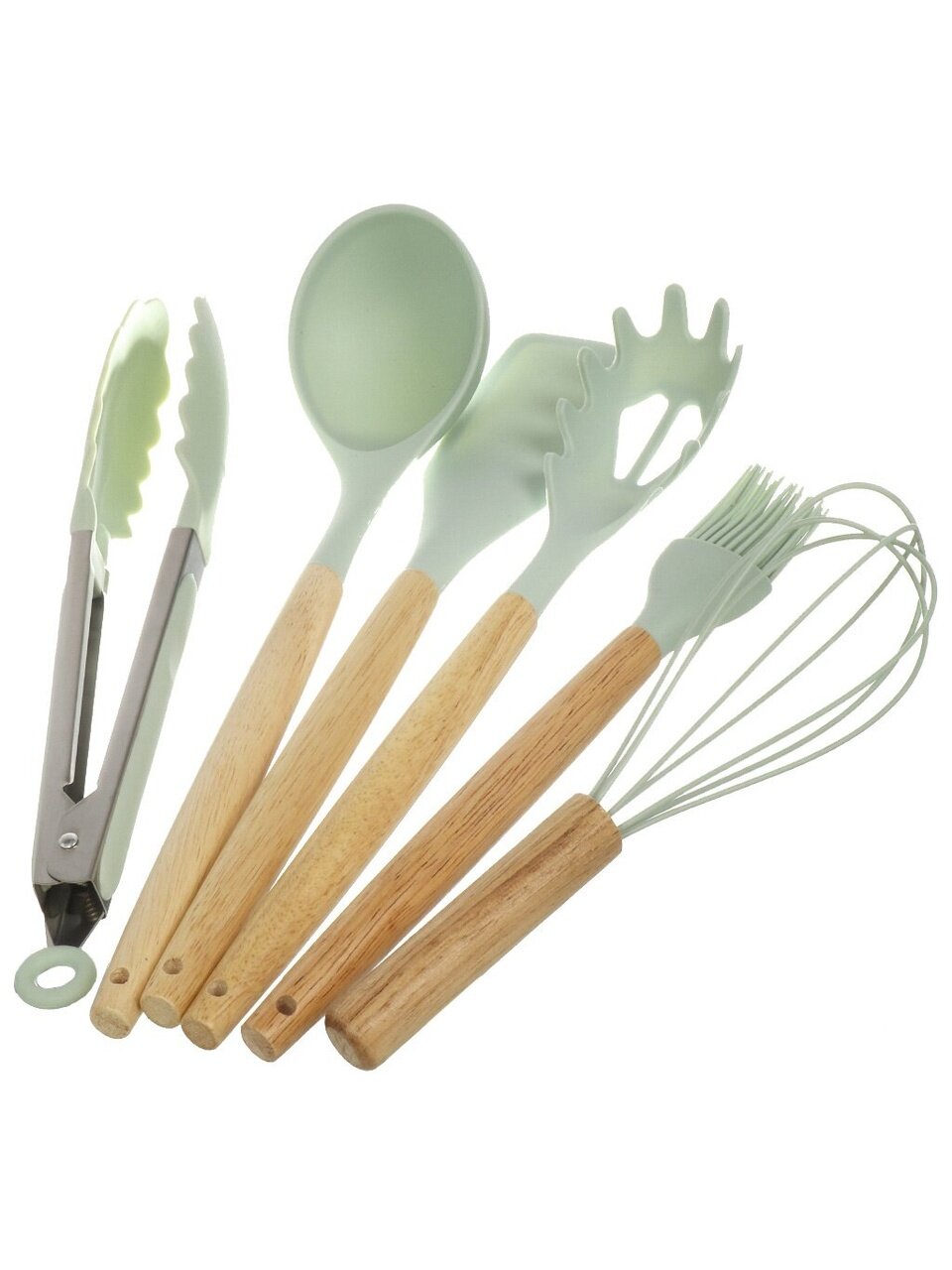 - Функциональность: в комплект входят все необходимые инструменты для готовки, включая лопатки, венчик, половник, кисточку, щипцы, ножницы и ножи.