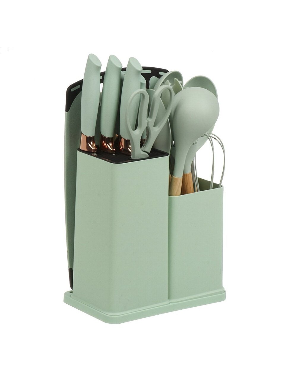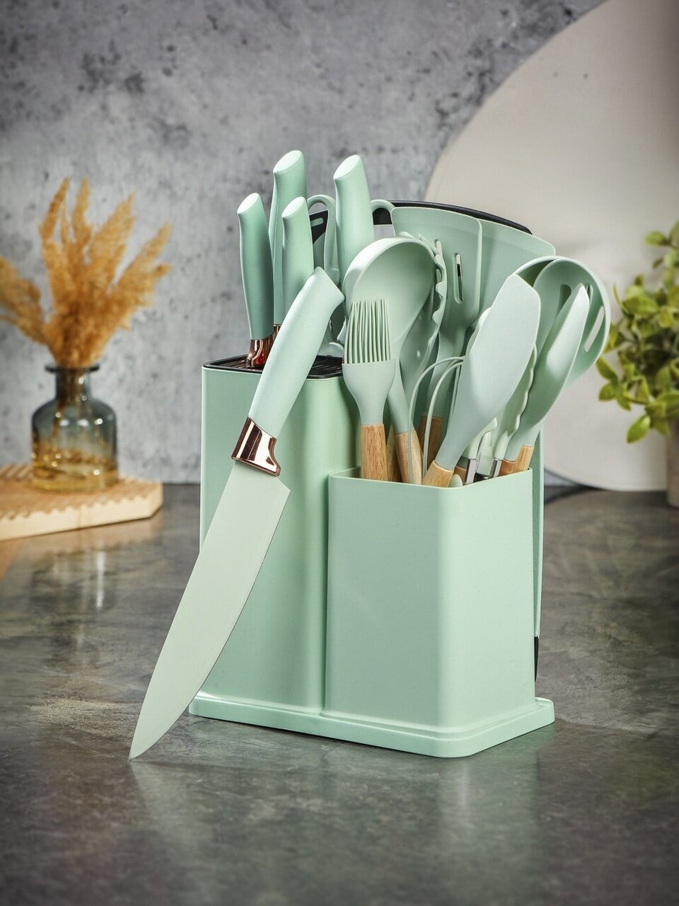 Покупая этот набор, клиент получает не просто кухонные инструменты, а целый арсенал для кулинарного творчества. Благодаря продуманному дизайну и высококачественным материалам, процесс готовки станет более приятным и безопасным, а кухня преобразится в уютное и стильное пространство. Забудьте о беспорядке и неудобствах — все принадлежности всегда будут под рукой, аккуратно расположенные на подставке. Это идеальный выбор для тех, кто ценит комфорт, стиль и качество.