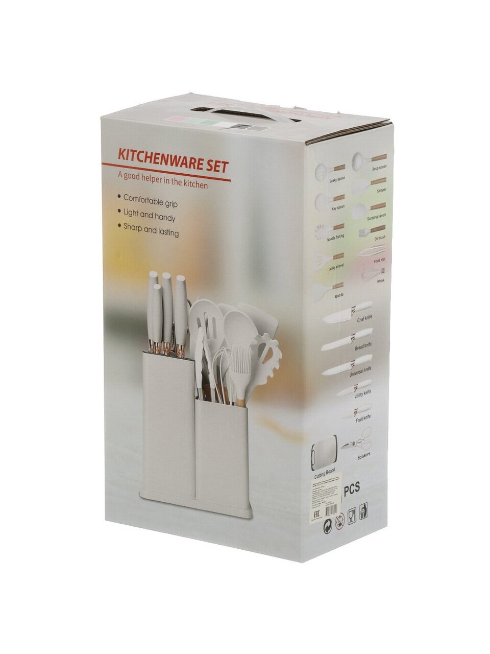 - Многофункциональность: в комплекте ножницы, ножи, лопатки, половник, кисточка, венчик и щипцы, позволяют готовить разнообразные блюда.