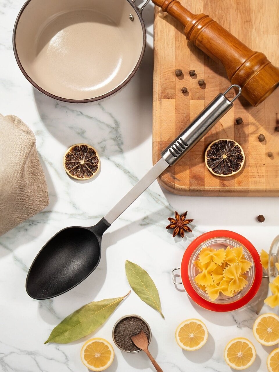 Ложка поварская нейлон, навеска, серая, Daniks Пасто — идеальный выбор для современной кухни. Практичный аксессуар для приготовления и сервировки гарниров, салатов и соусов. Совместимость с антипригарным покрытием обеспечивает бережное обращение с посудой. Эргономичная рукоятка из нержавеющей стали гарантирует комфорт и долговечность. Подвесная конструкция экономит место на кухне.