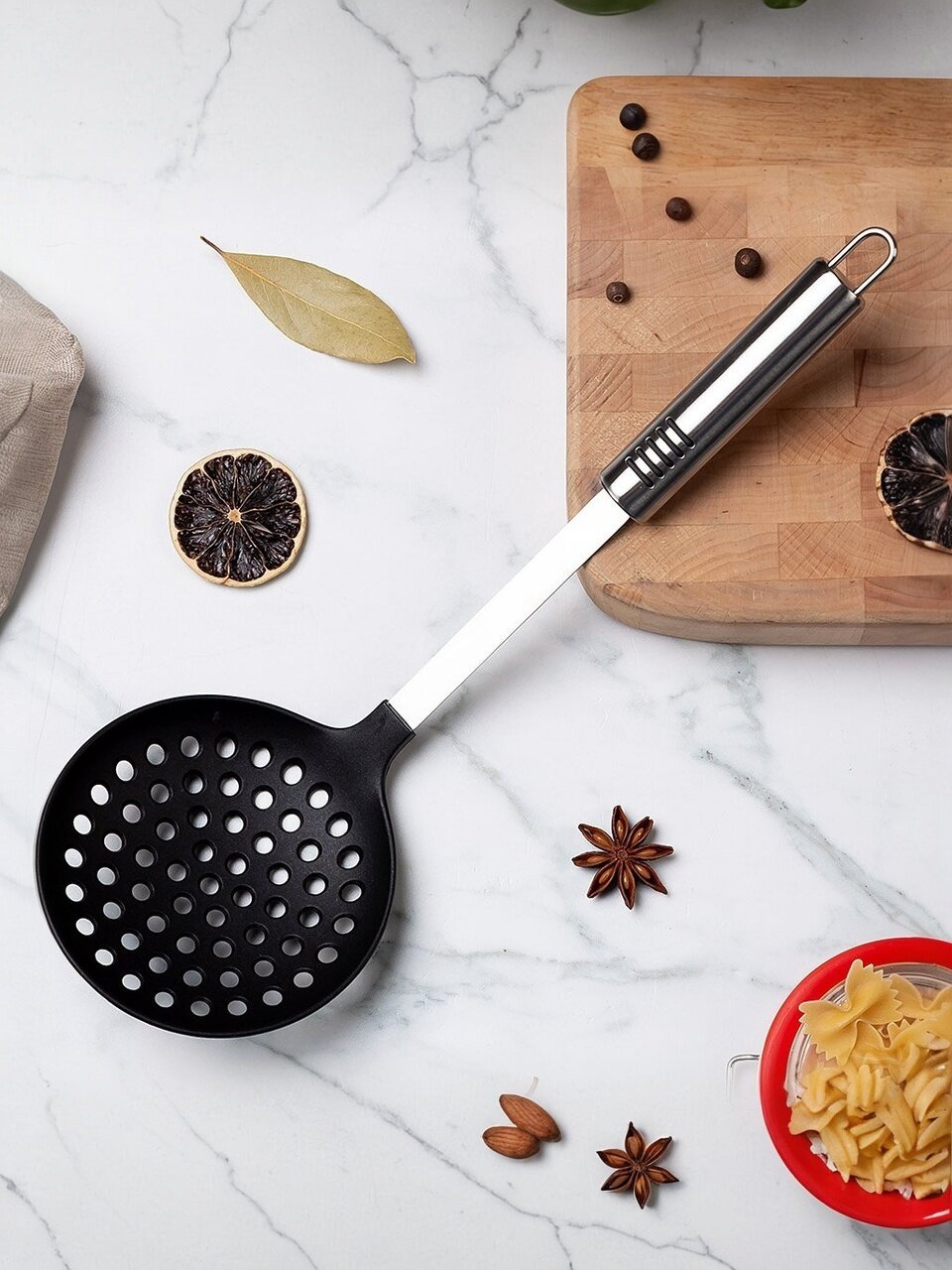Ложка кулинарная перфорированная выполнена из высококачественного термостойкого нейлона, он не выделяет вредных веществ при нагреве, неприхотлив в использовании. Все изделия абсолютно безопасны для любых антипригарных покрытий. Эргономичная ручка не позволит инструменту выскальзывать из рук. Нейлон - безопасен для еды, не токсичен, без запаха.