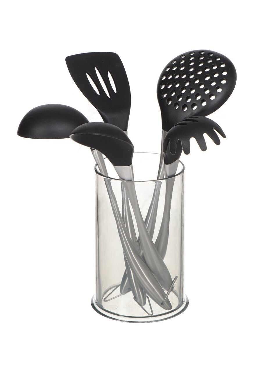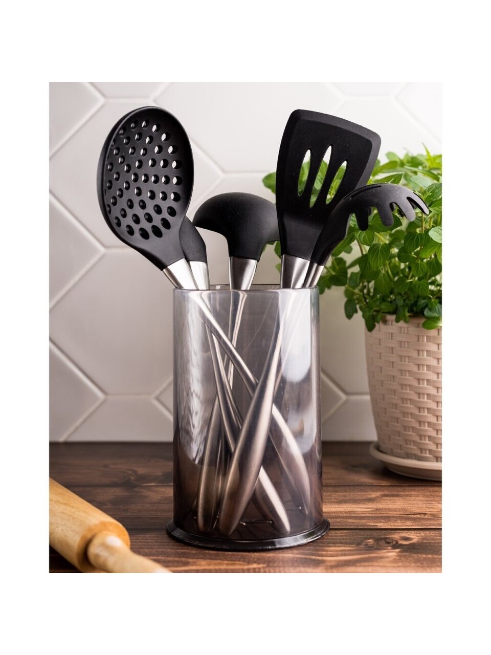 Практичная подставка из пластика позволяет удобно хранить все принадлежности в одном месте, экономя пространство на рабочей поверхности. Эргономичные рукоятки из нержавеющей стали обеспечивают комфортное и безопасное использование, а силиконовые рабочие части подходят для посуды с антипригарным покрытием, предотвращая появление царапин. Возможность мытья в посудомоечной машине значительно упрощает уход за комплектом, экономя время и силы.