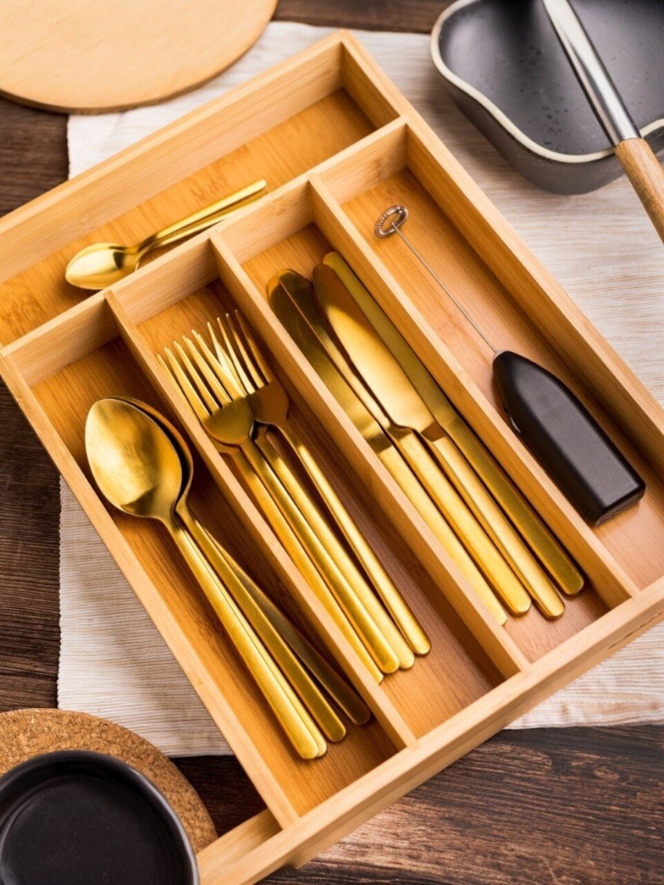 Лоток изготовлен из бамбука и имеет 5 отделений для столовых приборов и кухонной утвари. Оригинальная подставка для столовых приборов, выполненная из природного материала, украсит любую кухню. Хорошо впишется в любой интерьер. Не займет много места, а столовые приборы будут всегда под рукой.