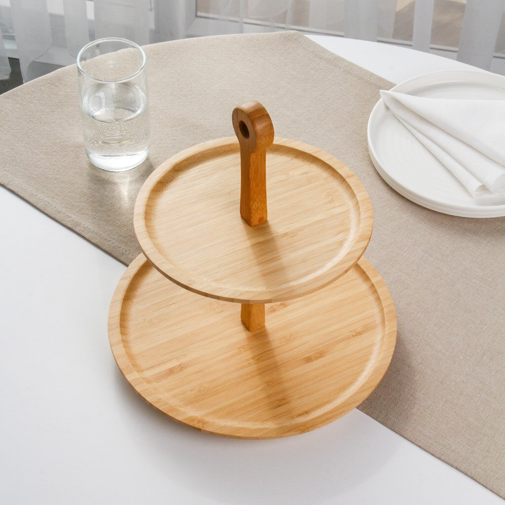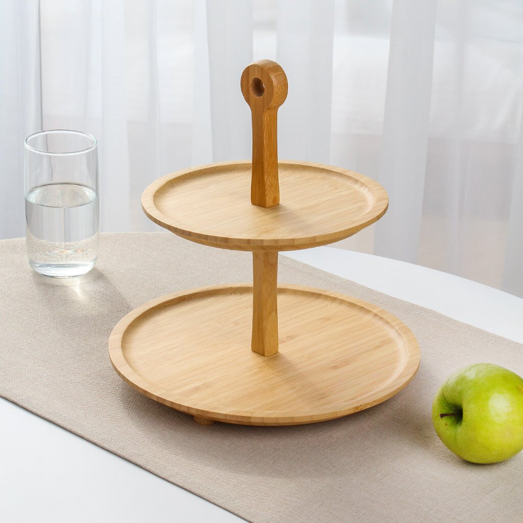 - Два яруса: компактно подаёт закуски, фрукты, десерты, экономит место на столе.