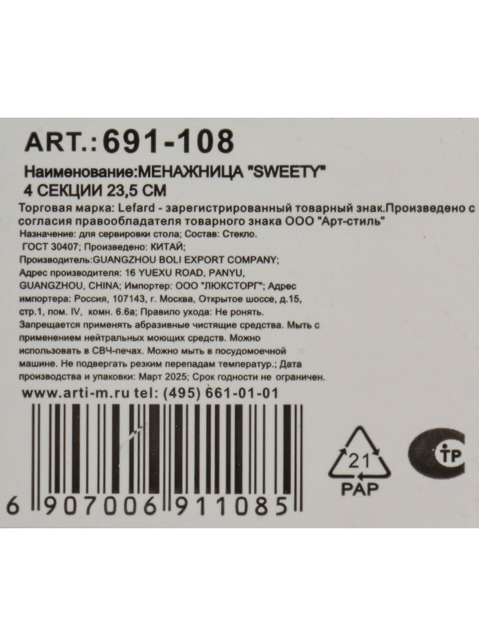 Вы можете приобрести «Менажница стекло, 23.5х2 см, 4 секции, Lefard, Sweety, 691-108» и другие товары в нашем интернет-магазине в Липецке по низким ценам и с бесплатным самовывозом.