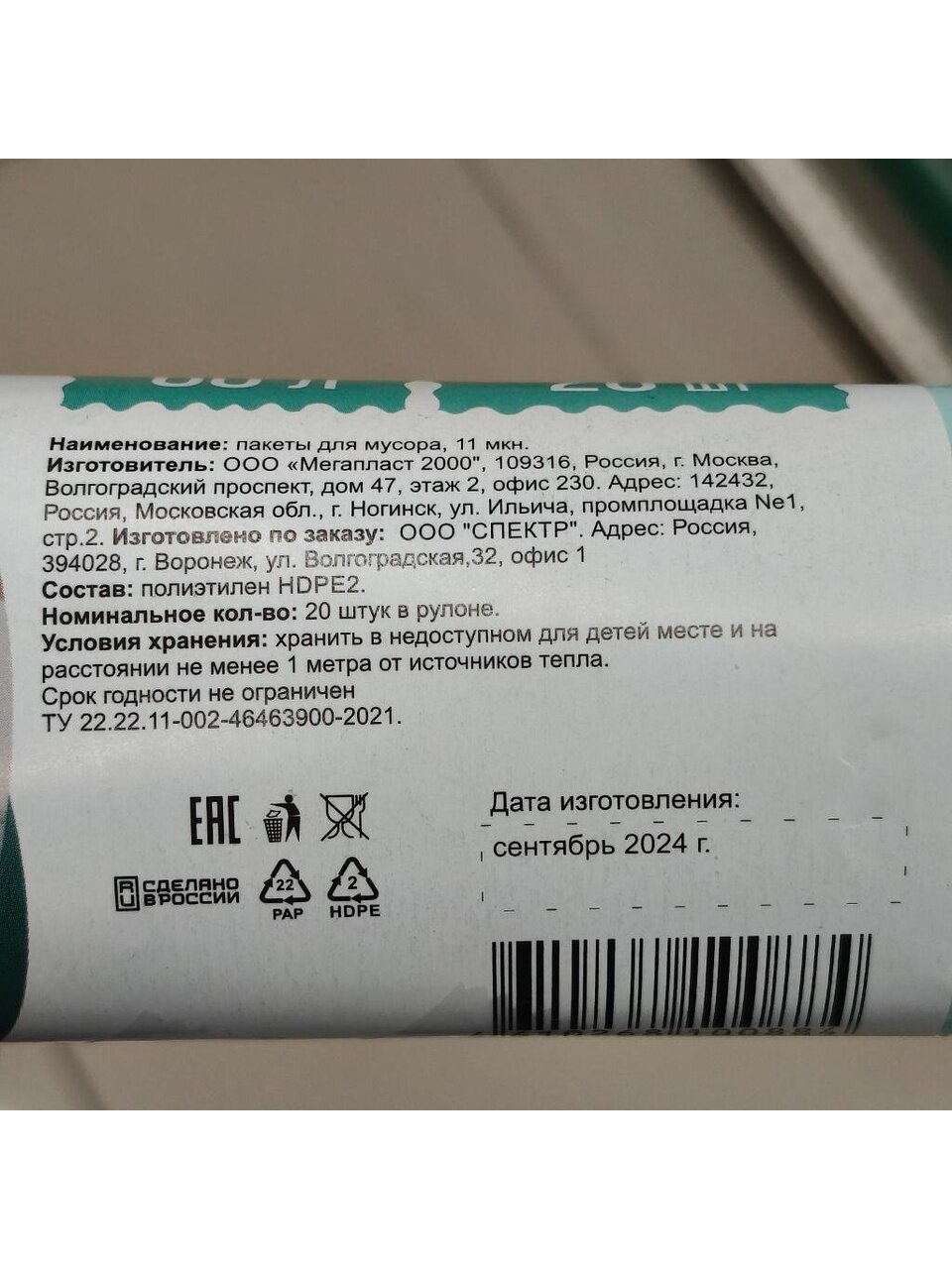 - Объем пакета: 60 литров.