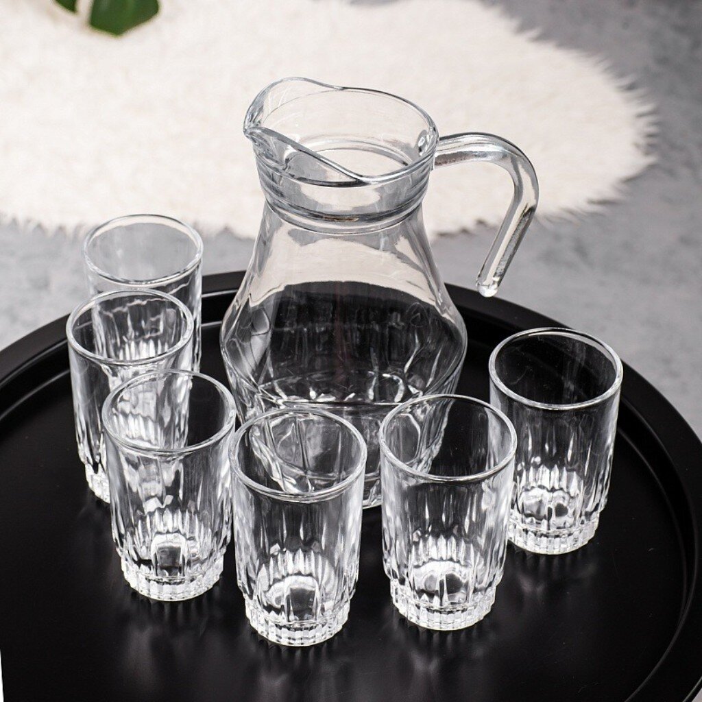 Стильный набор для сока Marjan: 7 предметов из безопасного стекла — кувшин 1,85 л и 6 стаканов, чтобы удобно и красиво подать напитки дома или на даче.