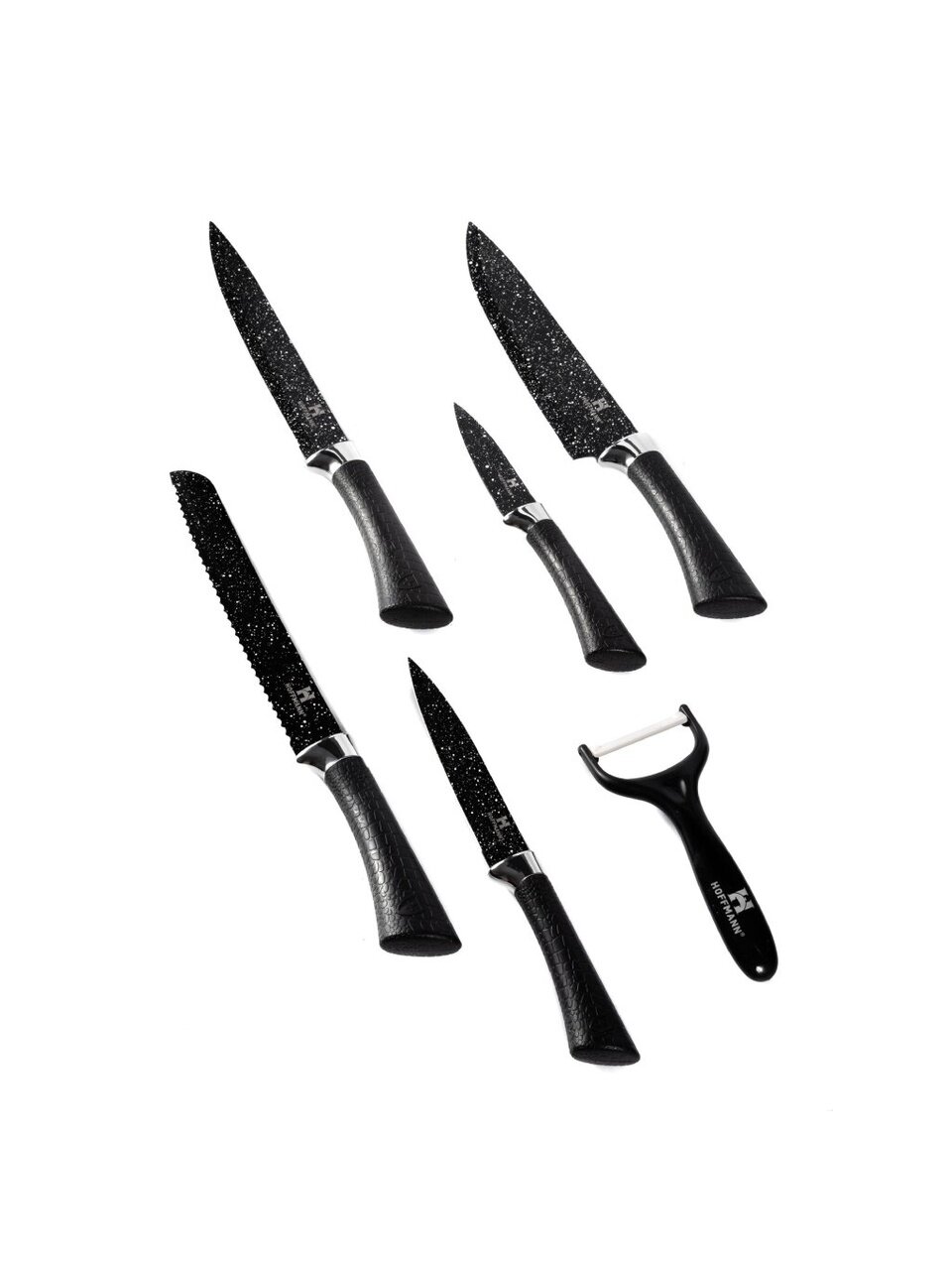 Стильная кухня начинается с продуманных инструментов. Набор ножей 7 предметов Hoffmann НМ 6643 — это сочетание современного дизайна, высокого качества и практичности для ежедневного использования. Каждый нож изготовлен из прочной нержавеющей стали, что гарантирует долгий срок службы и легкость ухода. Эргономичная пластиковая рукоятка обеспечивает надежный хват, а черный цвет набора гармонично впишется в любой интерьер кухни, подчеркнув вкус владельца.