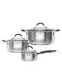 - Универсальные размеры: три кастрюли объёмом 1,5, 3 и 5 литров с прочными стеклянными крышками — удобно готовить для семьи или гостей