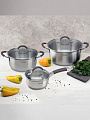 В набор Taller Лира входят три предмета: кастрюли объёмом 1,5, 3 и 5 литров, а также удобный ковш. Все крышки выполнены из прочного стекла.