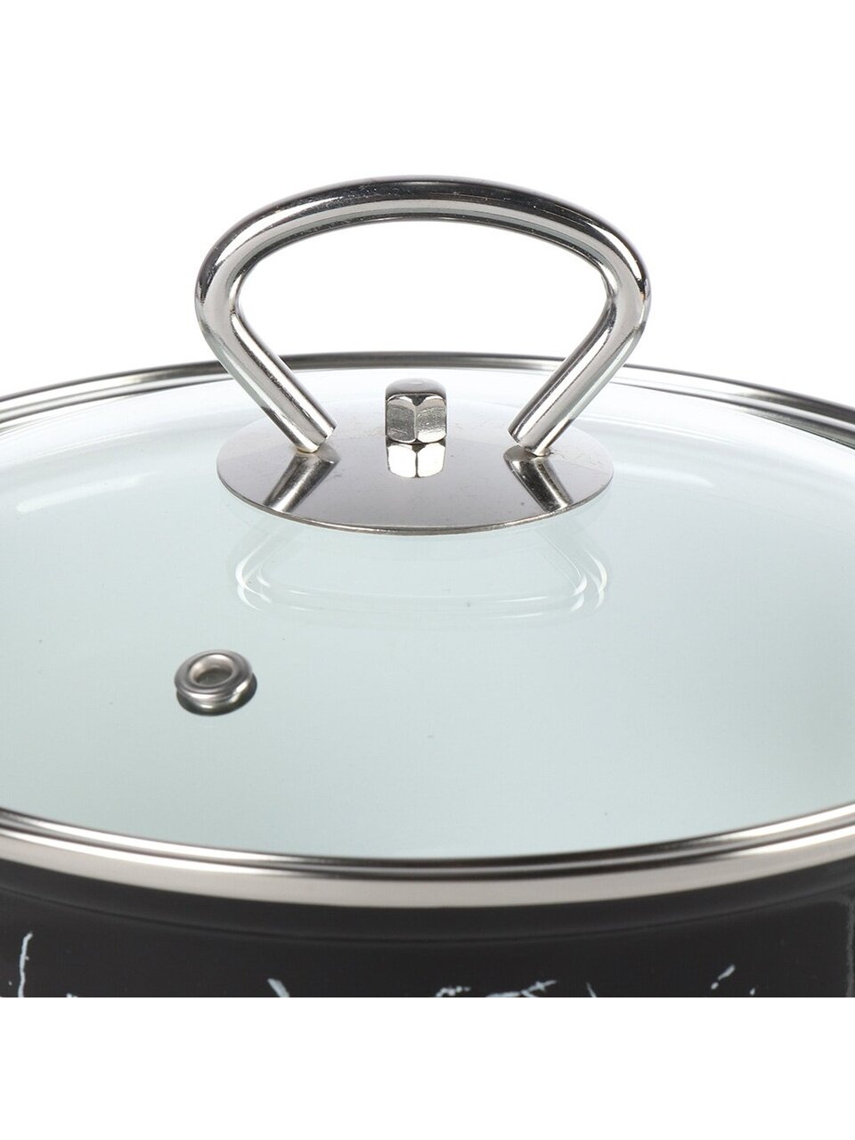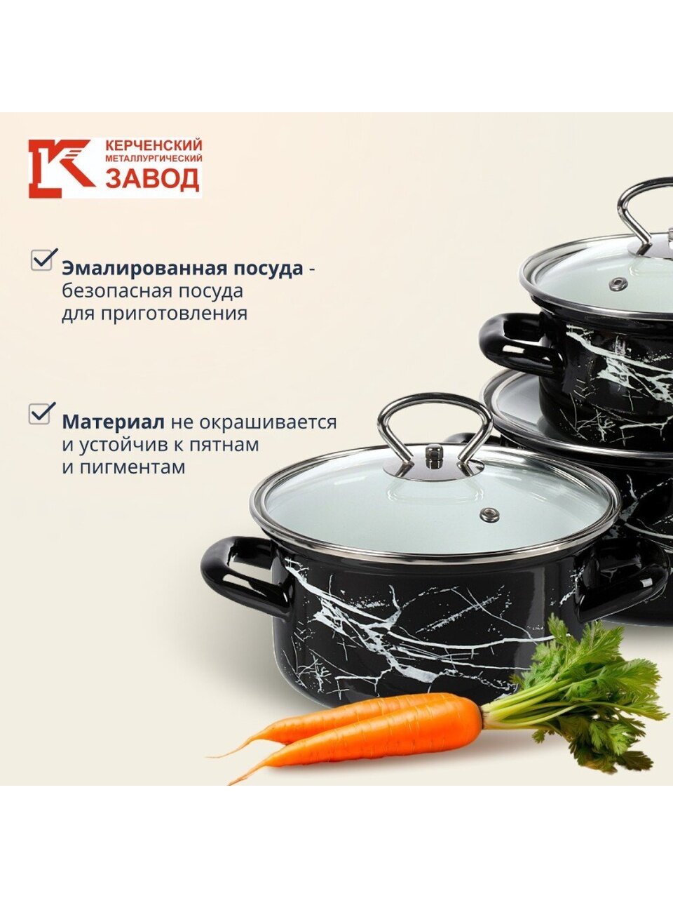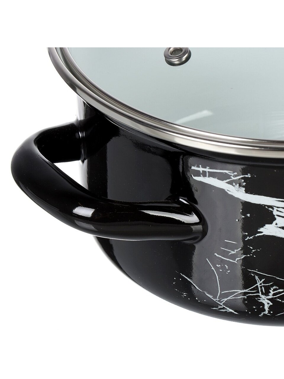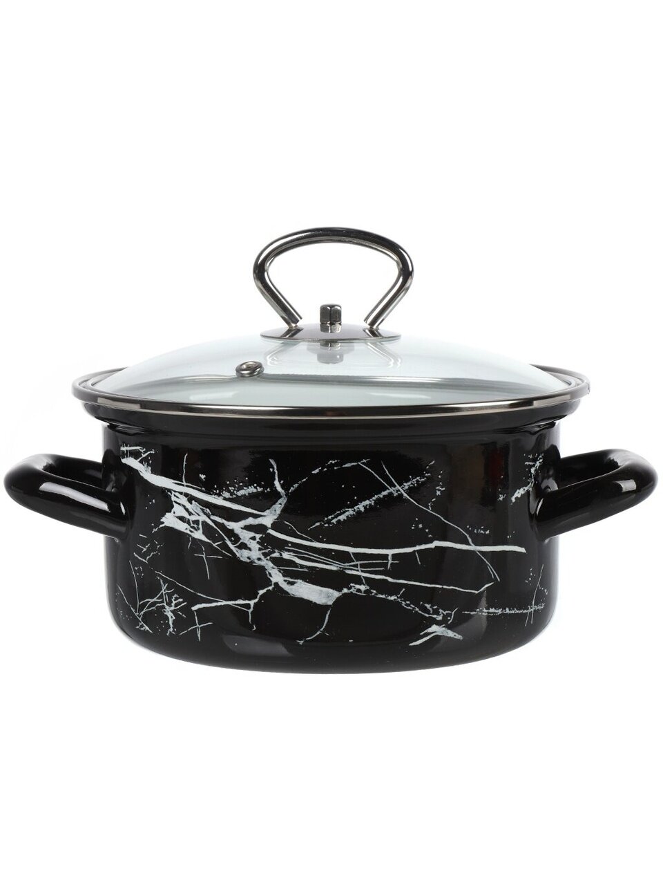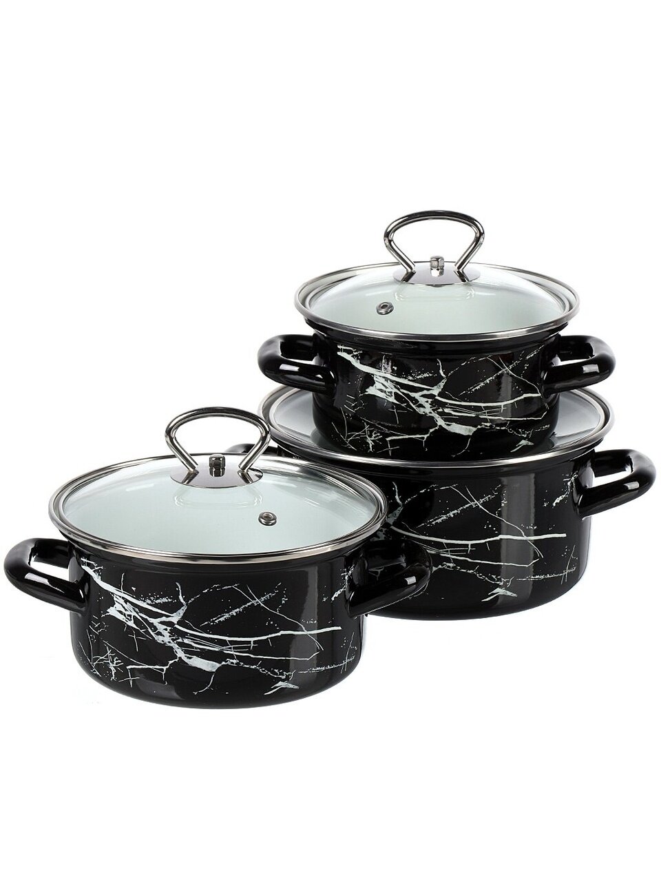 Набор кастрюль из эмалированной стали 3-в-1: стиль «Черный мрамор-Экстра», стеклянные крышки, для газовых и электрических плит — долговечность и элегантность на вашей кухне.