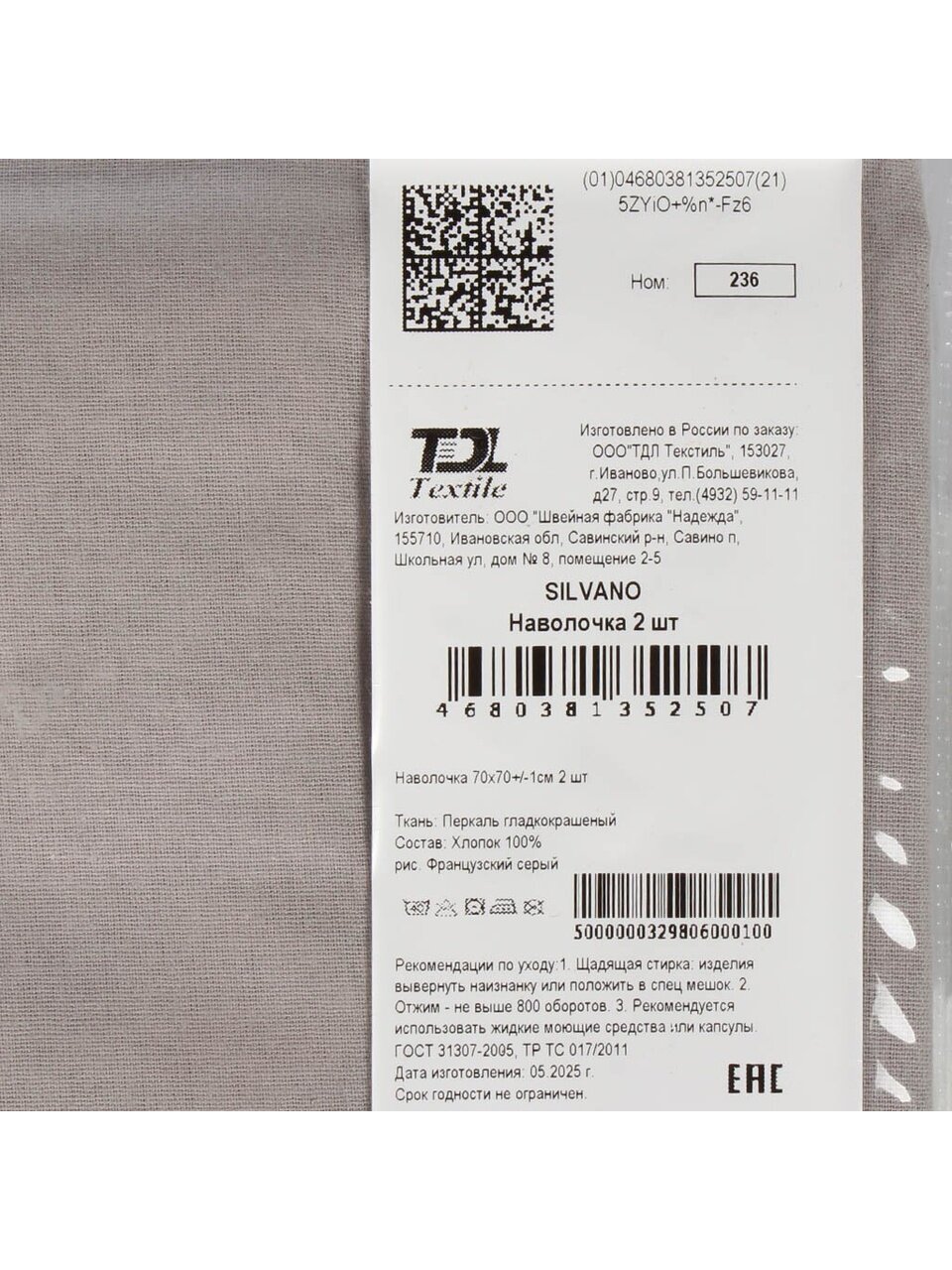 Наволочка 2 шт, Silvano, Французский серый, перкаль, 100% хлопок, 70 х 70 см, 110 г/м2
