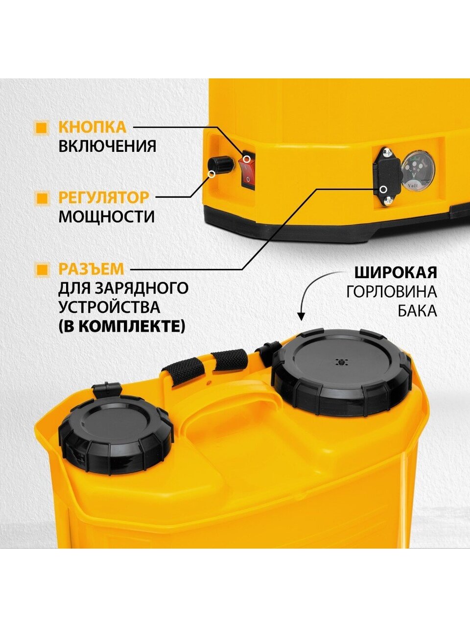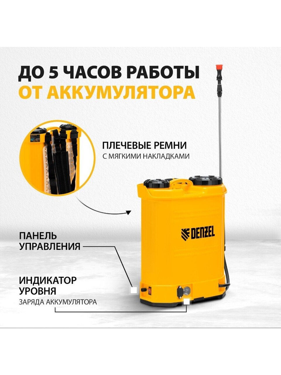 Представляем вашему вниманию аккумуляторный опрыскиватель Denzel D-16LA - идеальное решение для ухода за садом и огородом. Этот ранцевый инструмент с объемом 16 литров и емкостью аккумулятора 8 А.ч станет незаменимым помощником в борьбе с вредителями и для удобрения растений. Благодаря щелочному аккумулятору, работающему при напряжении 12 В, обеспечивается длительная и эффективная работа без необходимости частой подзарядки. Опрыскиватель выполнен из прочного пластика, что гарантирует долговечность и надежность в использовании. Яркий желтый цвет корпуса не только добавляет стильности, но и делает устройство заметным в саду.