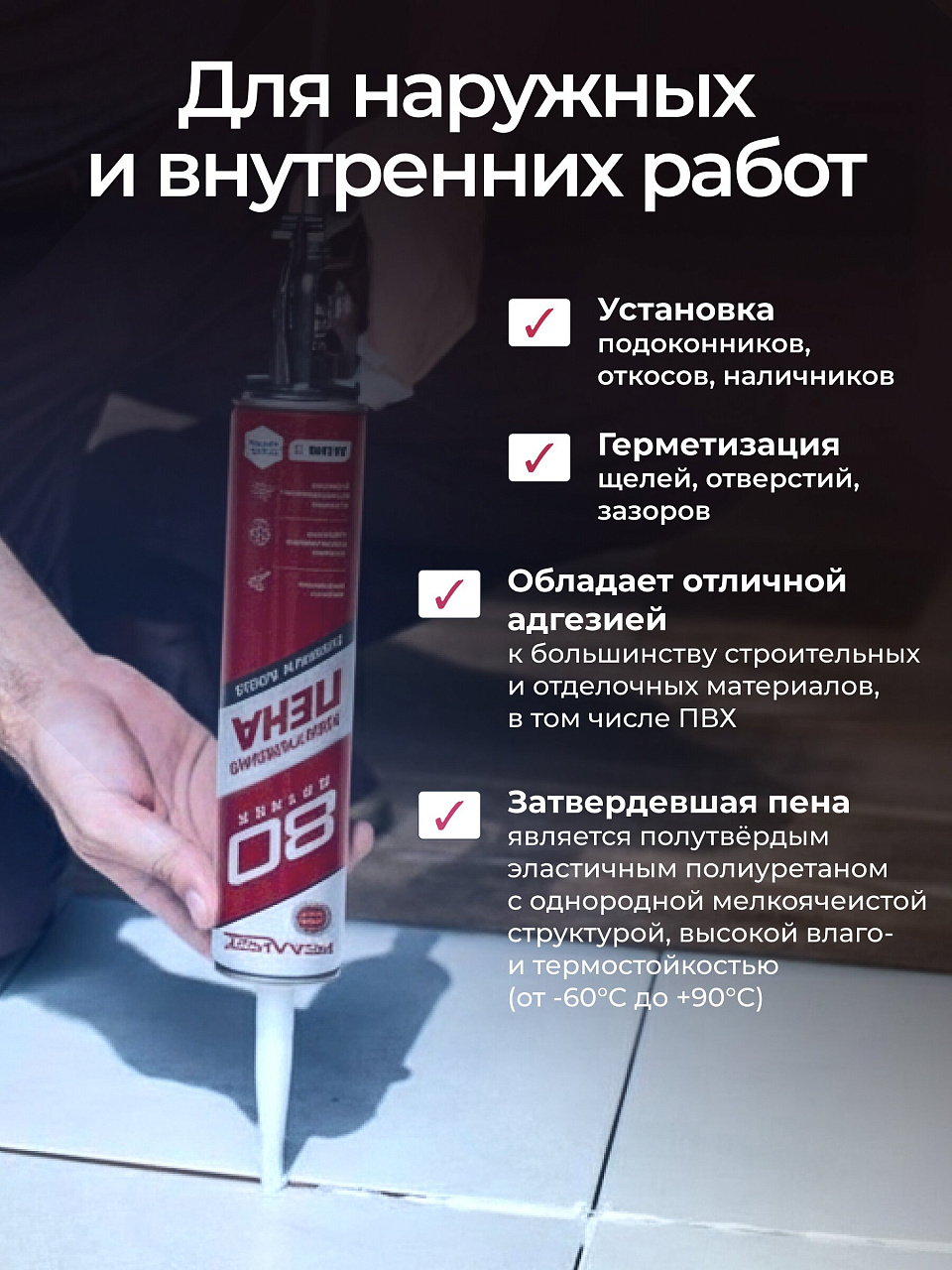 - Обладает отличной адгезией к большинству строительных и отделочных материалов, в том числе ПВХ.