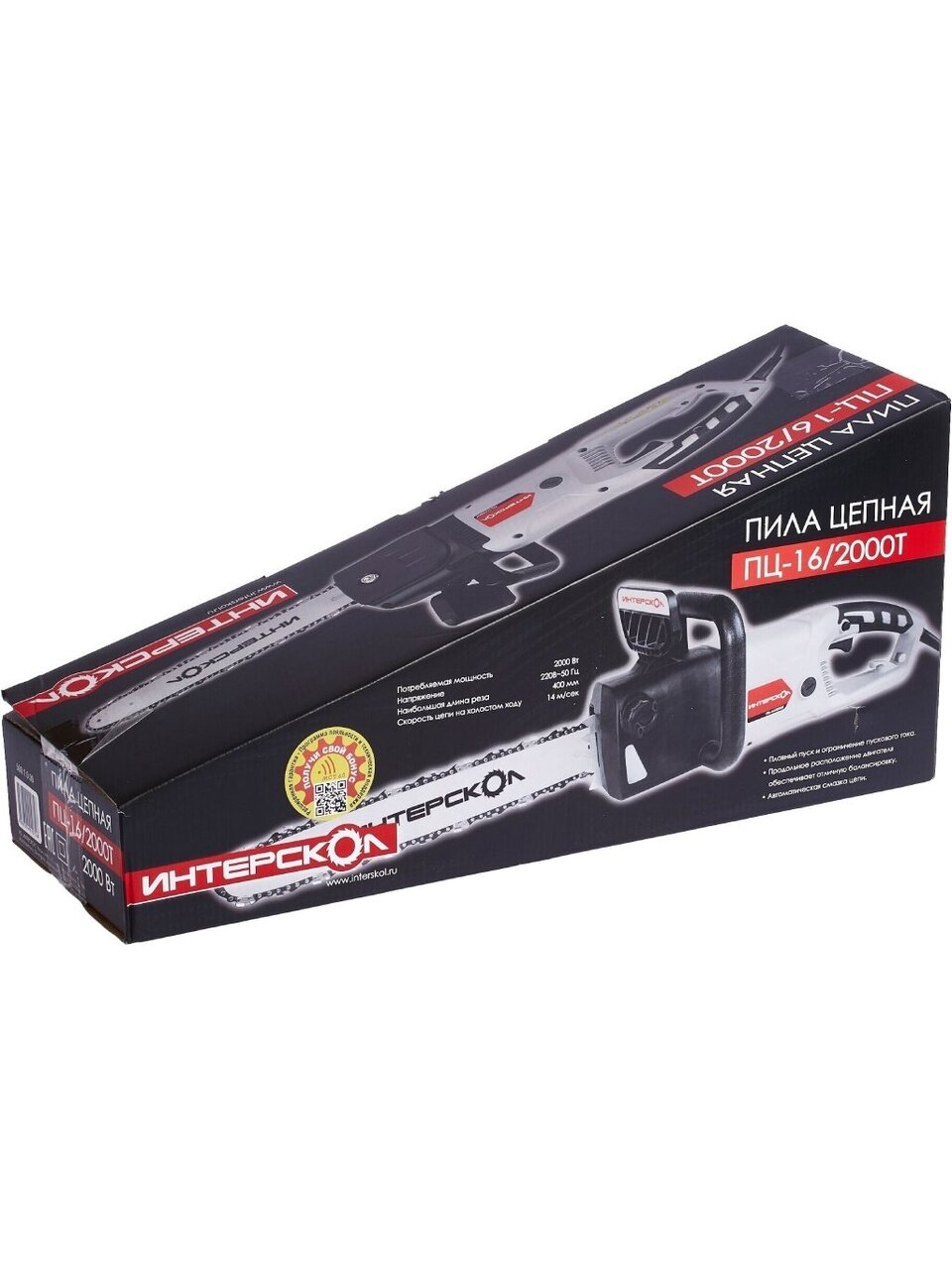 Пила Интерскол ПЦ-16/2000Т состоит из пластмассового корпуса, в котором размещён электродвигатель, служащий приводом; редуктора в металлическом корпусе с пластиковым наружным кожухом; механического тормозного устройства и пильного аппарата, состоящего из шины и пильной цепи.