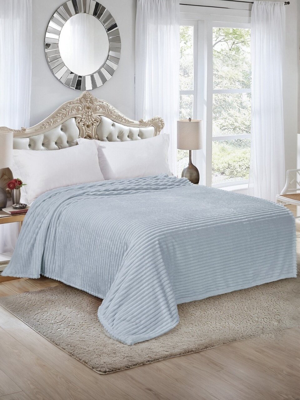 - Плюшевый велсофт жаккард — премиальная мягкость, приятная на ощупь текстура, эстетика светло-голубых полосок