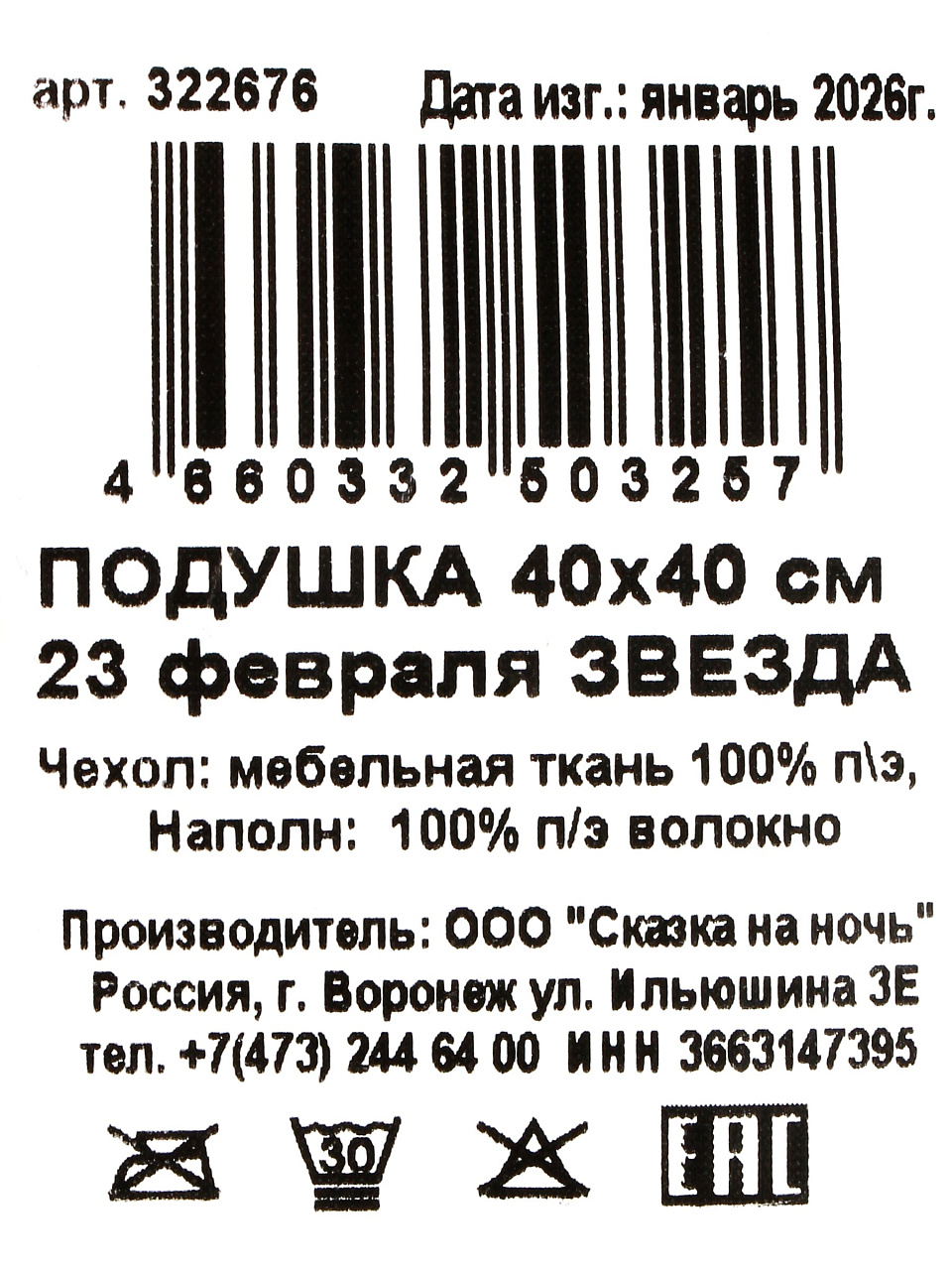 Ключевые отличия: оригинальный праздничный дизайн «23 Февраля, Звезда», прочный полиэстер, оптимальный размер 40х40 см, универсальность для разных сценариев использования.