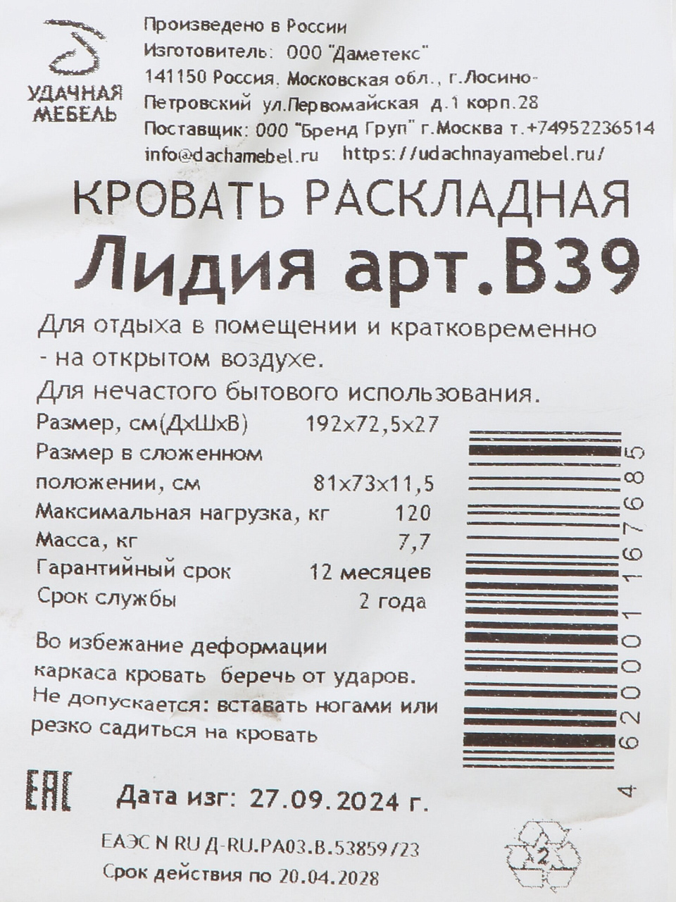 Сделайте выбор в пользу долговечности и комфорта — закажите раскладушку Лидия В39 с доставкой. Цена — без лишних наценок, гарантия качества и быстрая отправка по России.