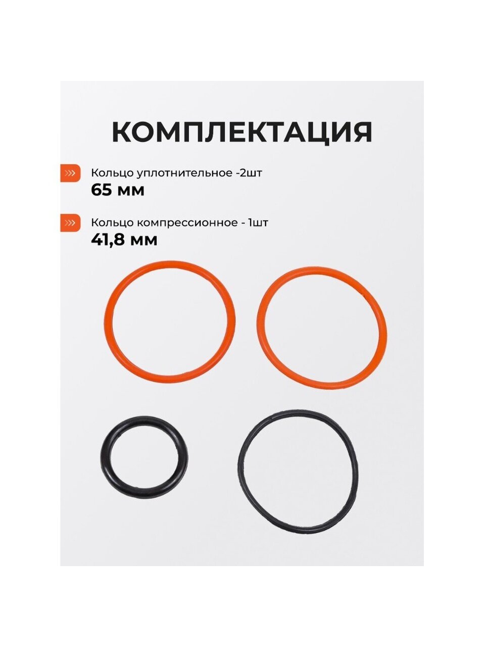 Комплектация: кольцо уплотнительное (диаметр 65 мм) 2 шт, кольцо компрессионное (диаметр 41.8 мм) 1 шт, клапан насоса,завихритель.