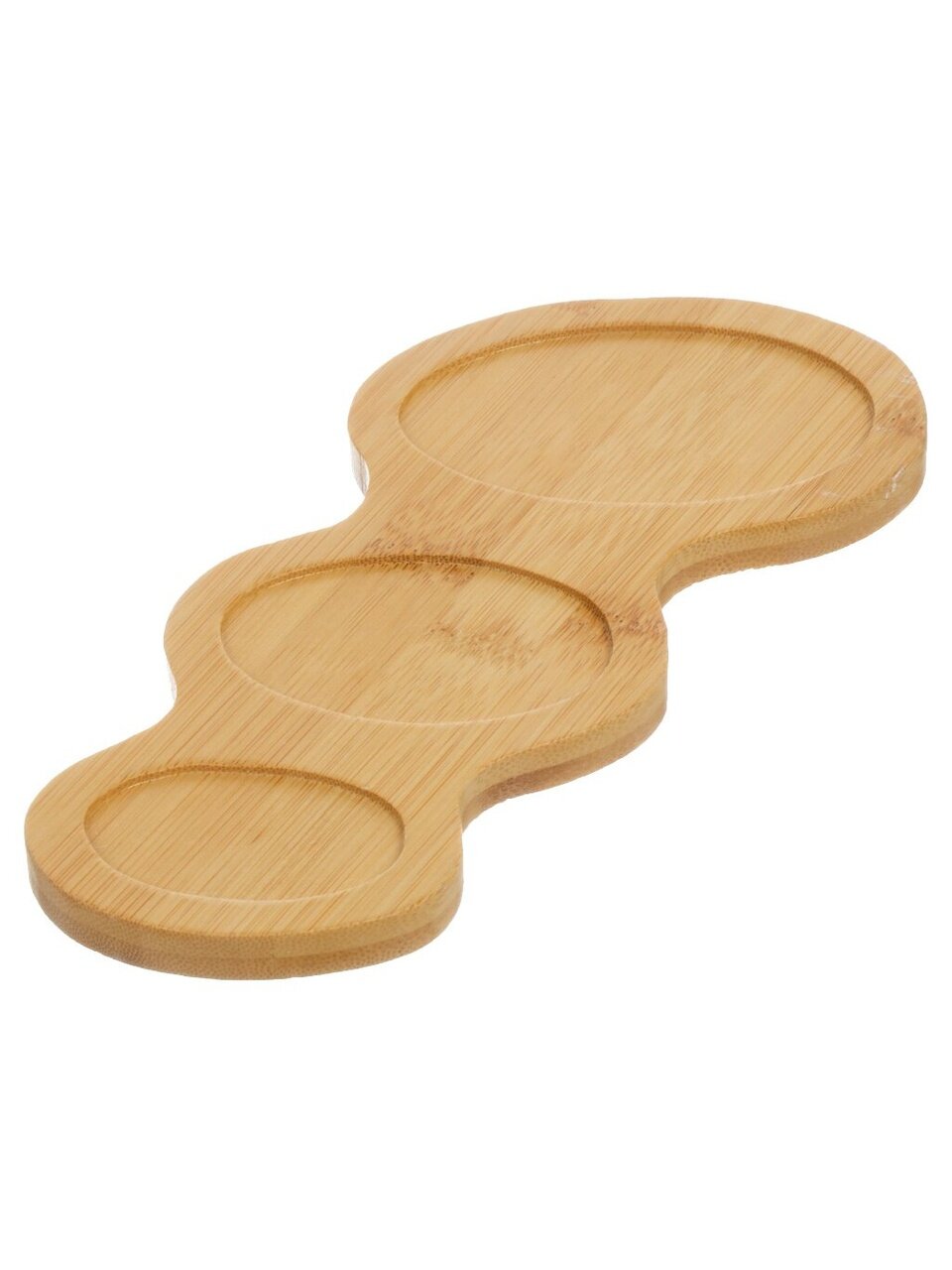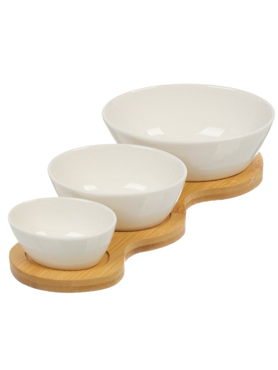 - Уникальный дизайн: три фарфоровых салатника на подставке из натурального дерева — акцент в сервировке стола