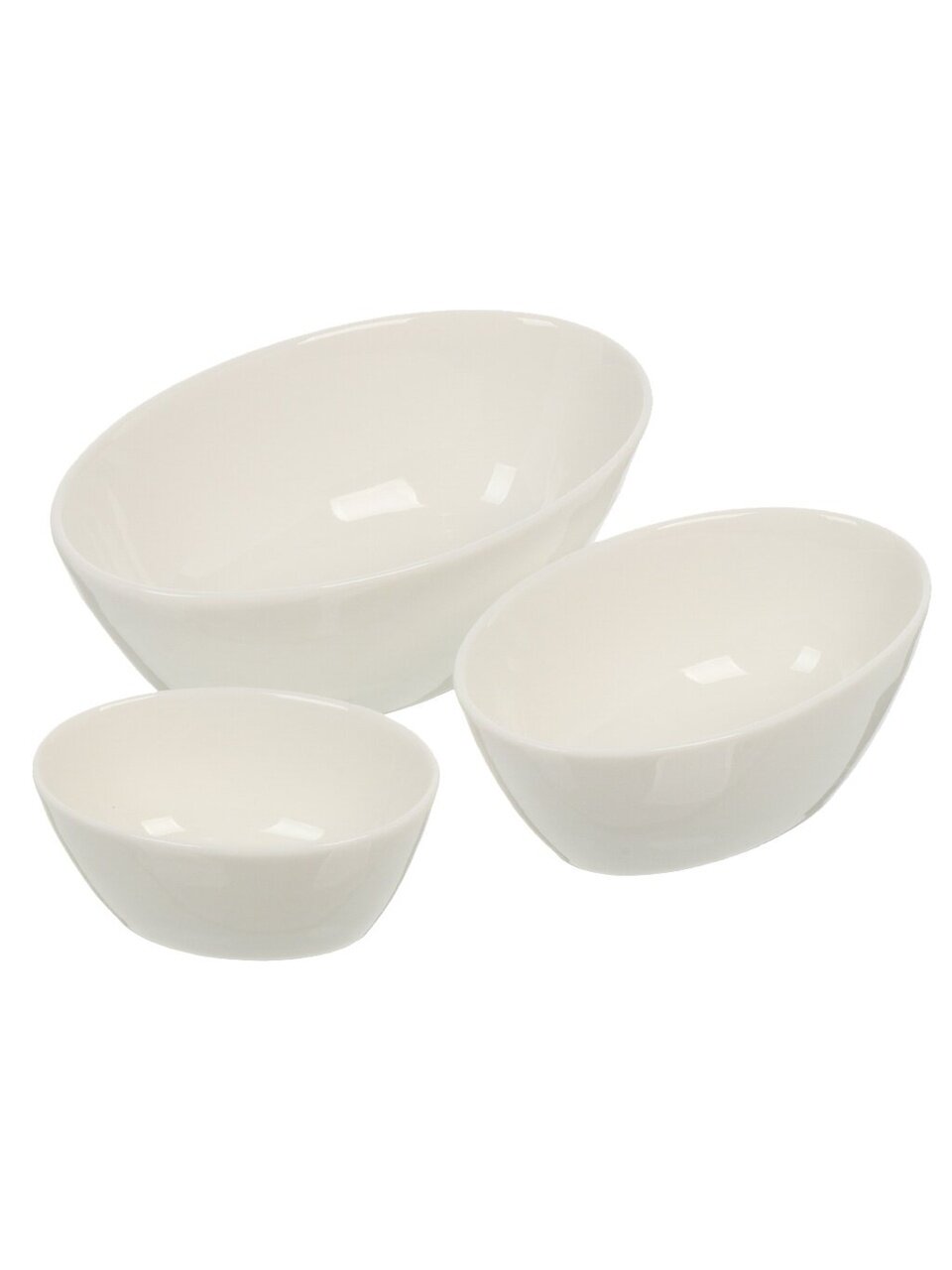 В наборе три круглых фарфоровых салатника: объёмы 175 мл, 100 мл и 50 мл, высота каждого — 5 см, диаметр подставки 21,1×11,5 см. Цвет белый, стиль — современный, дизайн — однотонный.