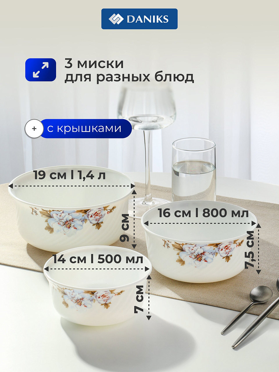 Салатники Daniks Орлеан: стильный стеклокерамический набор 3 в 1 с крышками — для сервировки, хранения и микроволновки. Практичное решение для дома и дачи.
