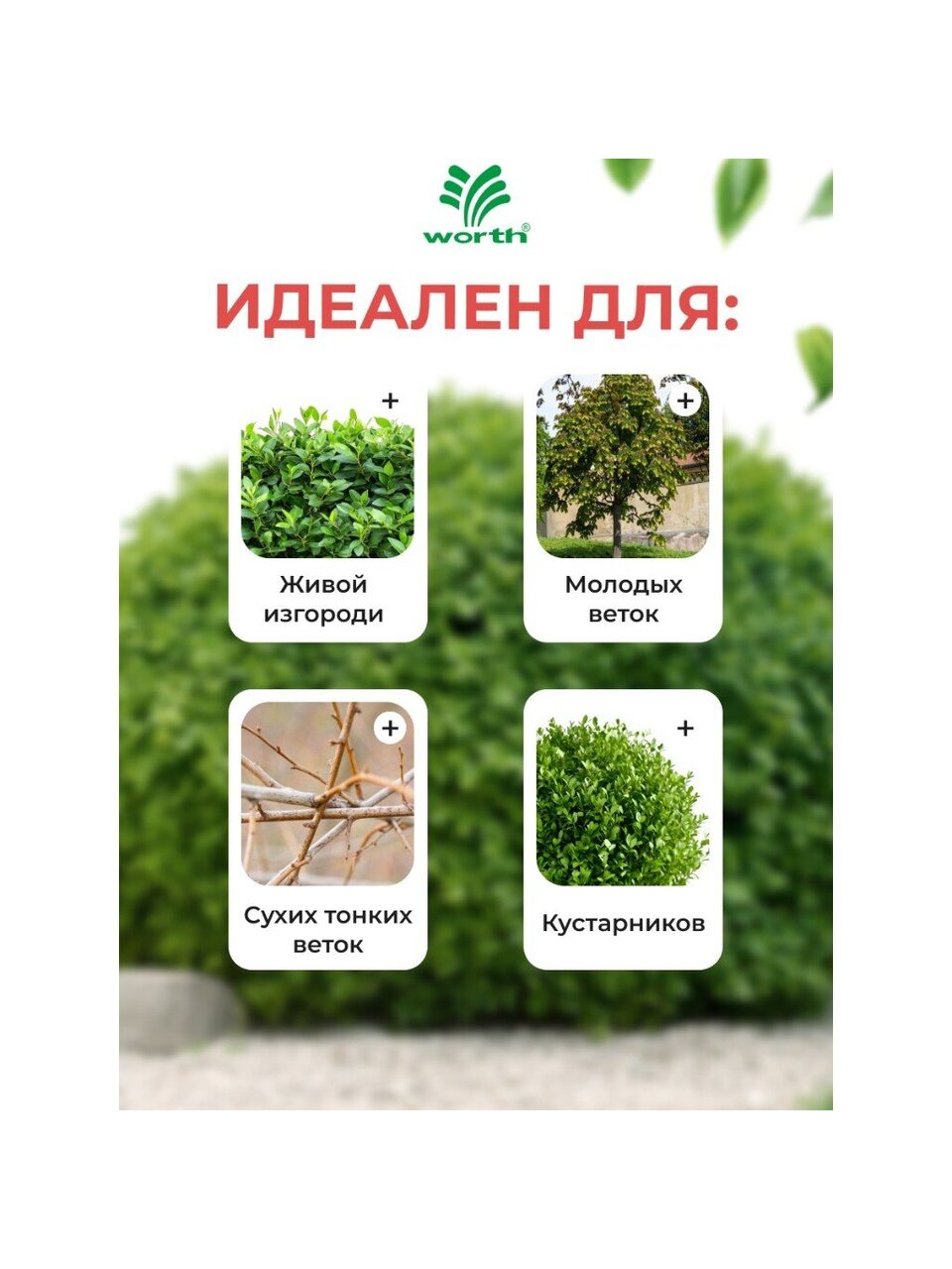 - Форма лезвия позволяет создавать декоративные формы и узоры при стрижке живой изгороди.