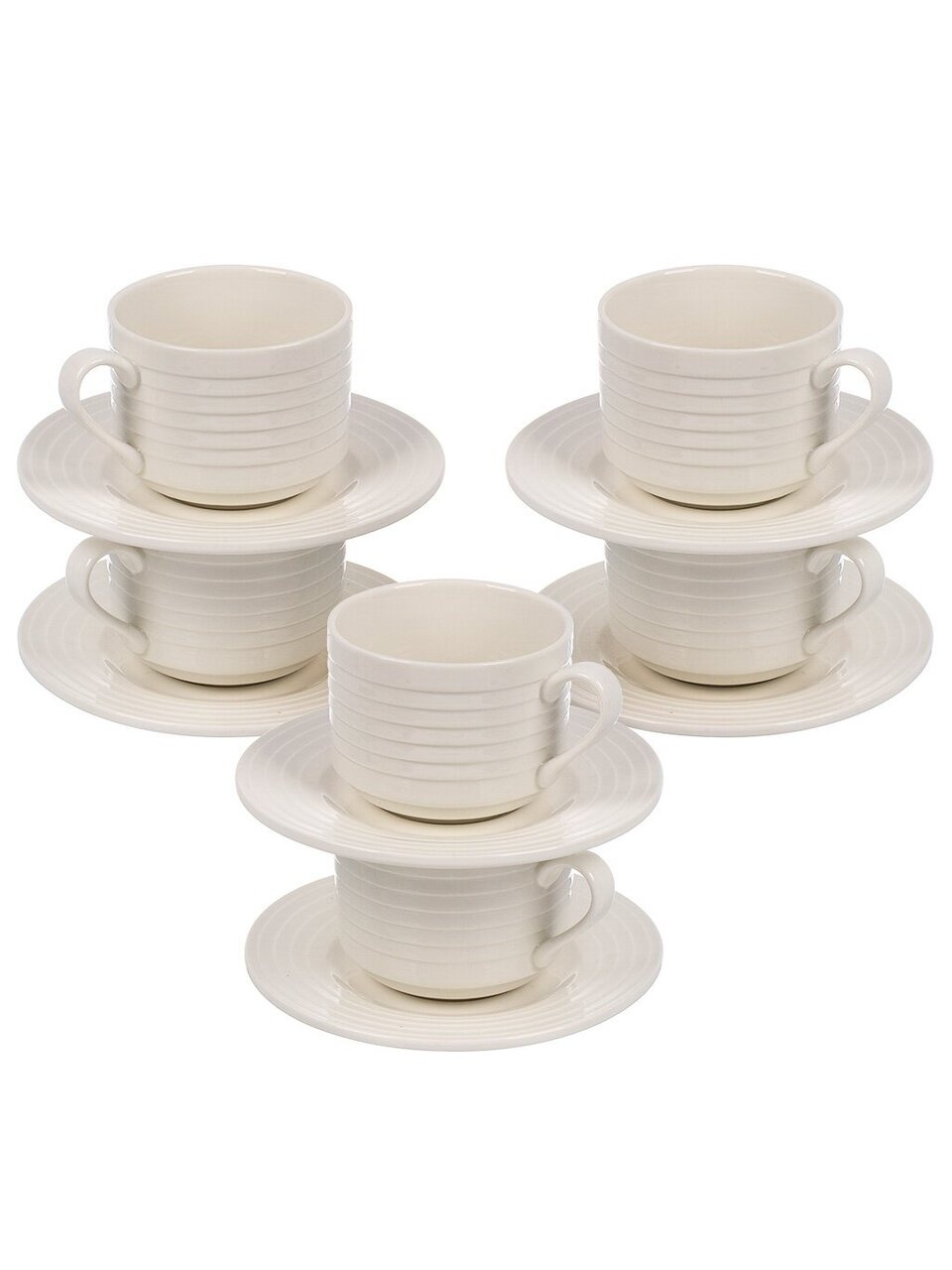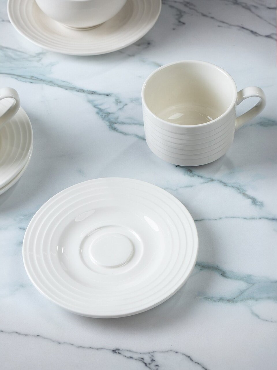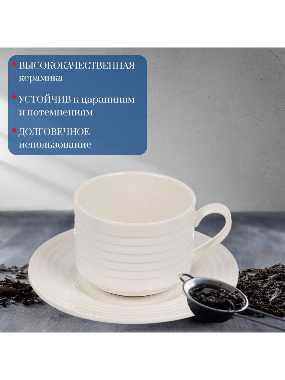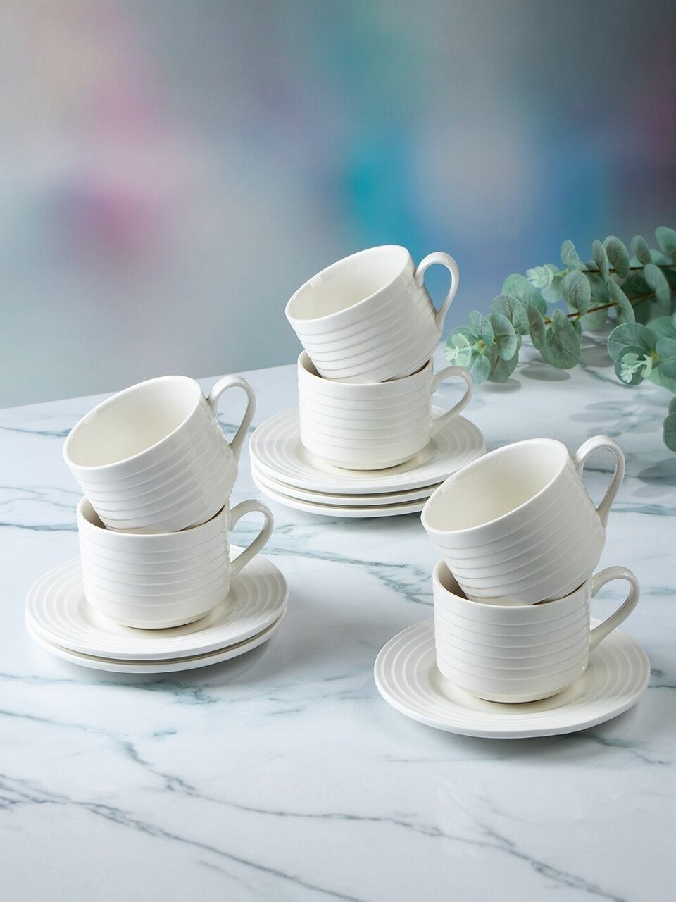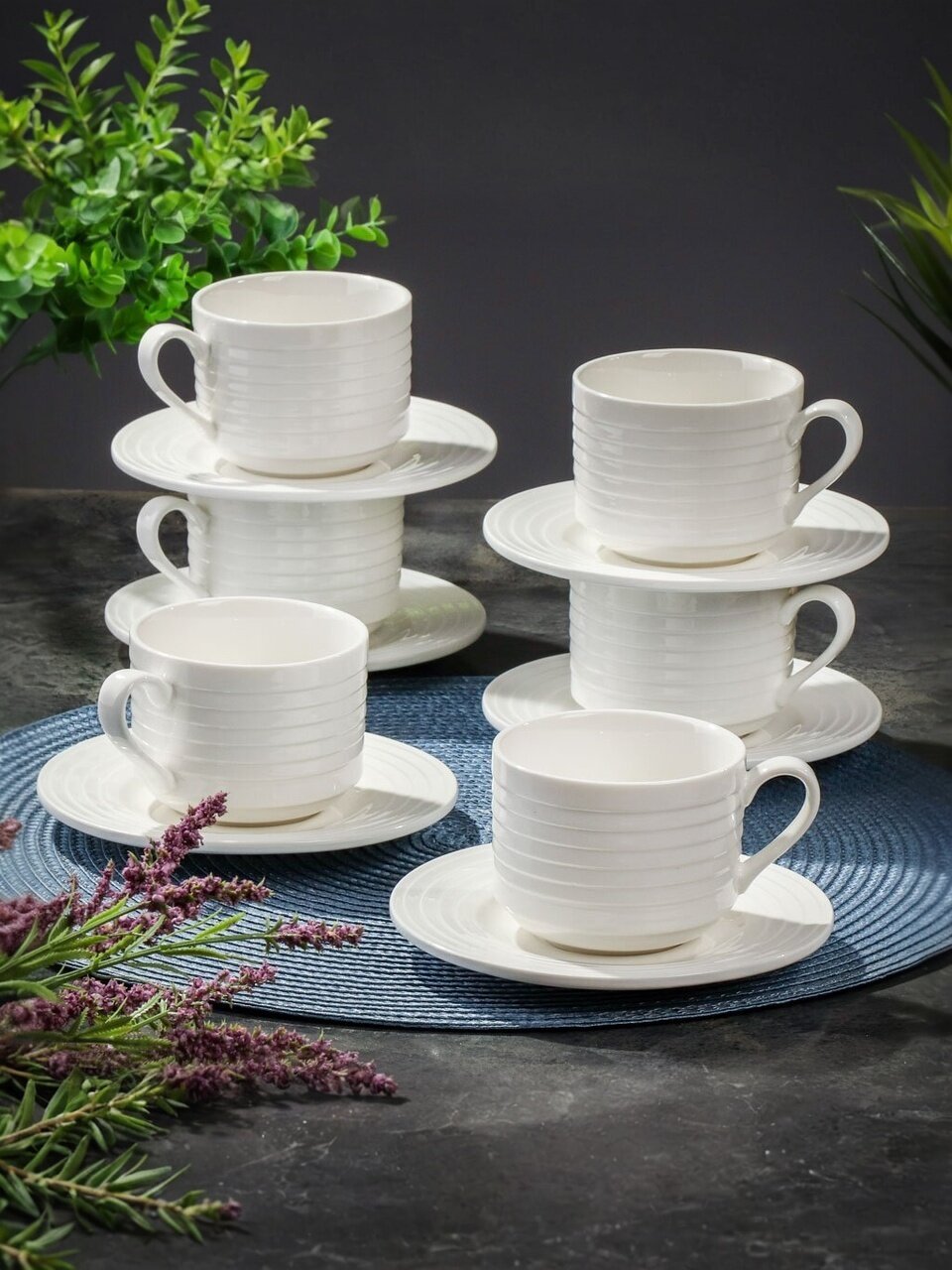 Набор чайных пар Daniks «Полоса» — это 12 предметов из долговечной керамики, рассчитанных на 6 персон. Благодаря лаконичному белому цвету и классическому стилю, набор легко впишется в любую сервировку, будь то домашний ужин или дачный завтрак. Объем чашки — 175 мл: этого достаточно для полноценной чайной церемонии, но и удобно для кофе или других напитков.