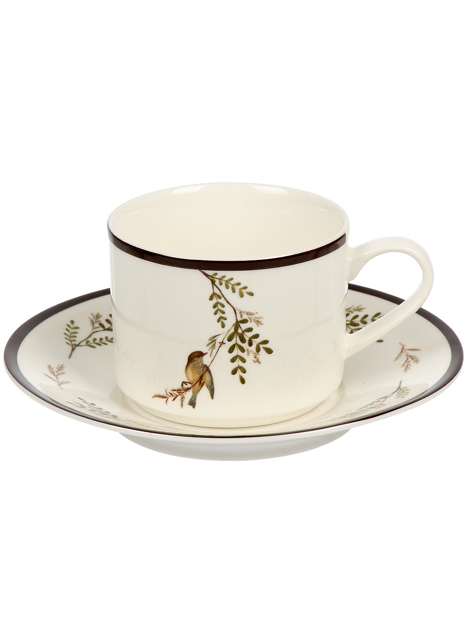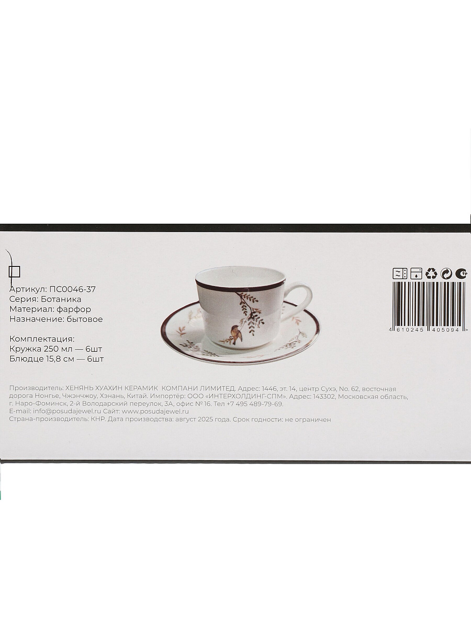 В наборе 12 предметов: 6 чашек и 6 блюдец из высококачественного фарфора с ботаническим декором. Материал не впитывает запахи, не тускнеет, рассчитан на долгий срок службы.