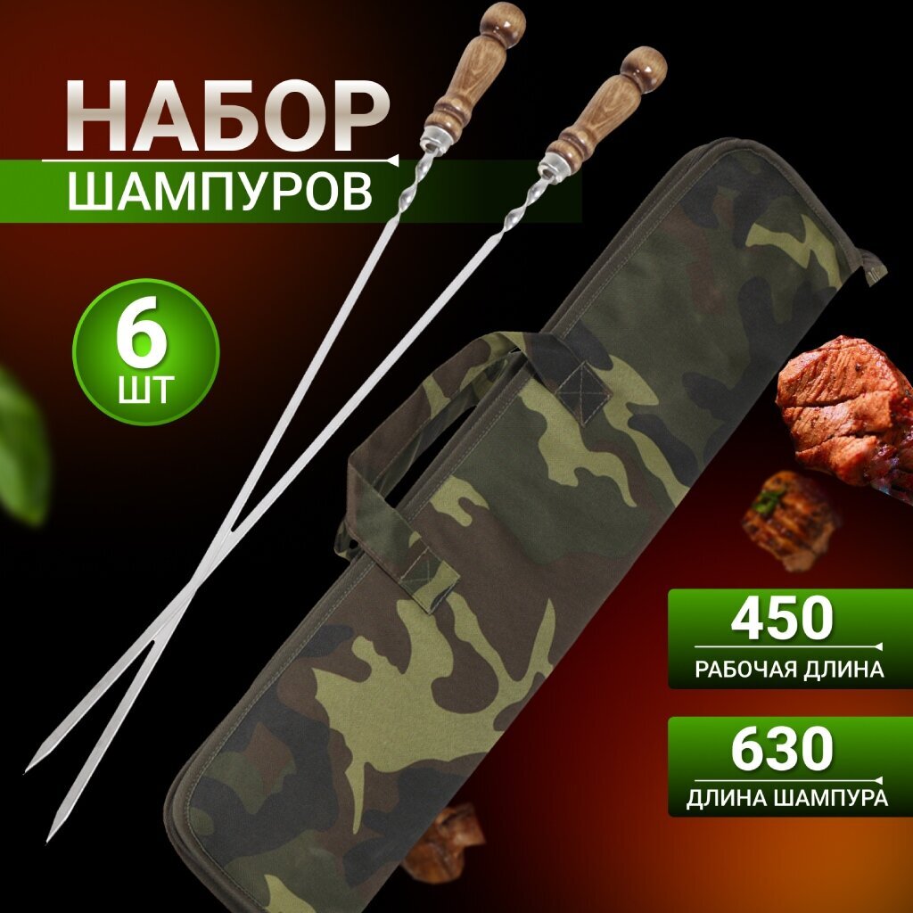 - Данный набор шампуров — идеальный вариант для тех, кто ценит отдых на природе и любит готовить вкусную еду на открытом огне. В комплекте 6 шампуров из нержавеющей стали с деревянными ручками, которые удобно лежат в руке и не скользят.