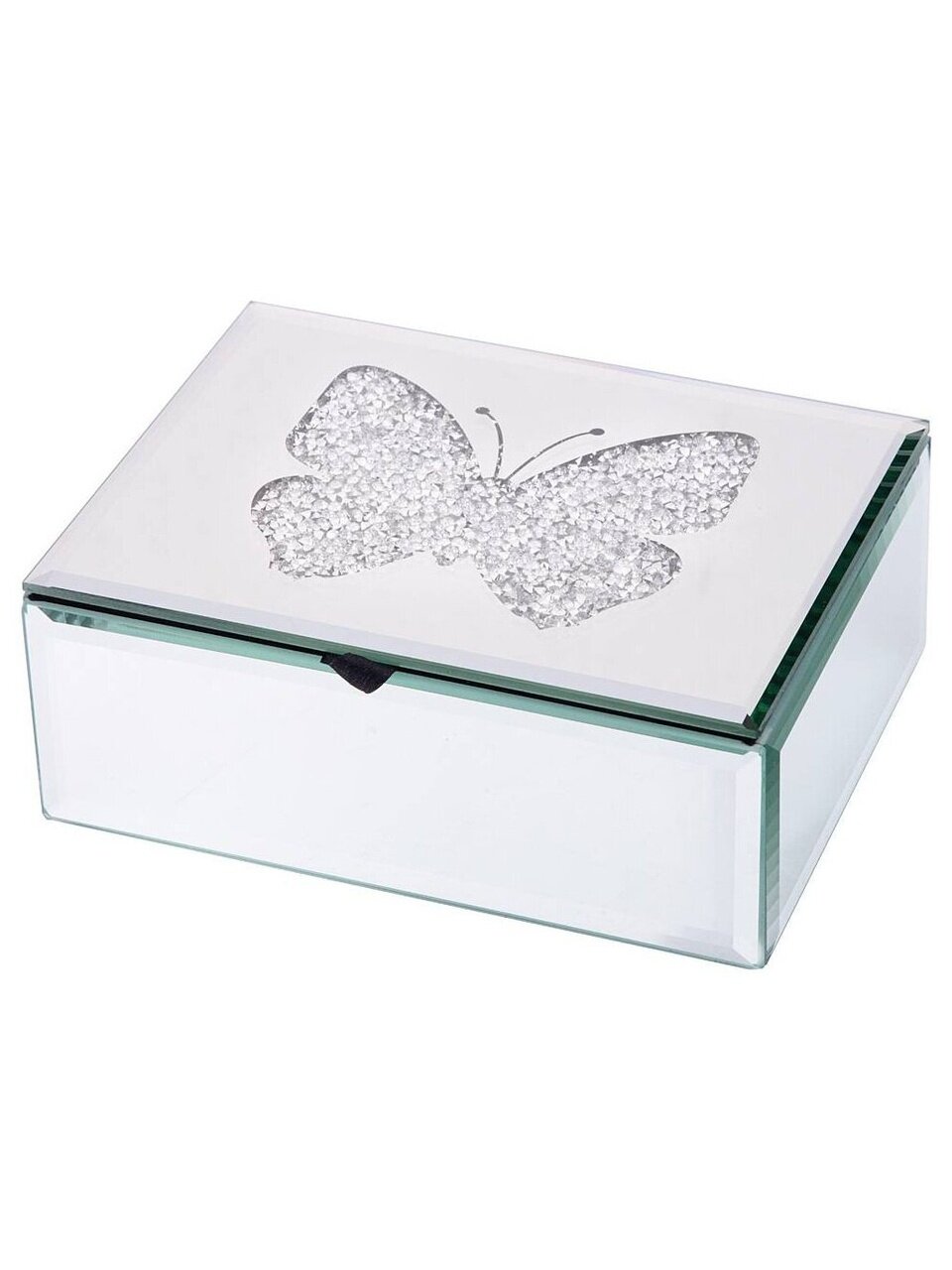 Шкатулка выполнена из качественного материала МДФ и украшена стеклянными элементами, что придает ей особый блеск и изысканность. Зеркальная поверхность с изящным изображением бабочки добавляет нотку утонченности и легкости, делая шкатулку не просто функциональным предметом, а настоящим произведением искусства. Серебристый цвет гармонично впишется в любой интерьер, будь то классический или современный стиль.