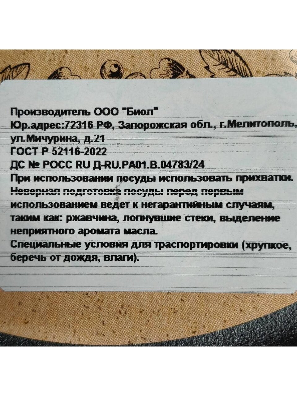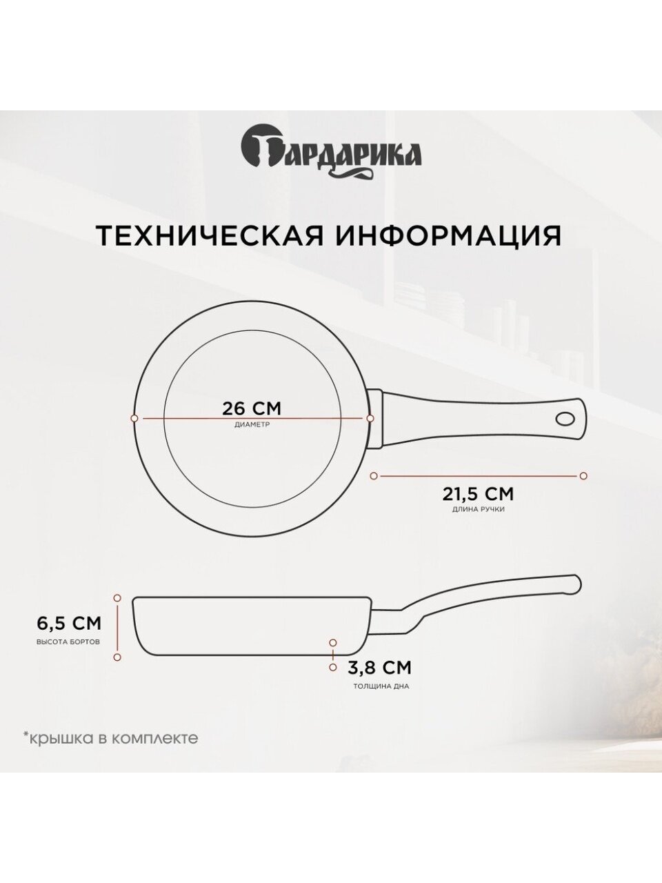 Высота борта — 65 мм, толщина дна — 3,8 мм, стенки — 3,2 мм. Это обеспечивает равномерный нагрев и предотвращает деформацию даже при интенсивном использовании.