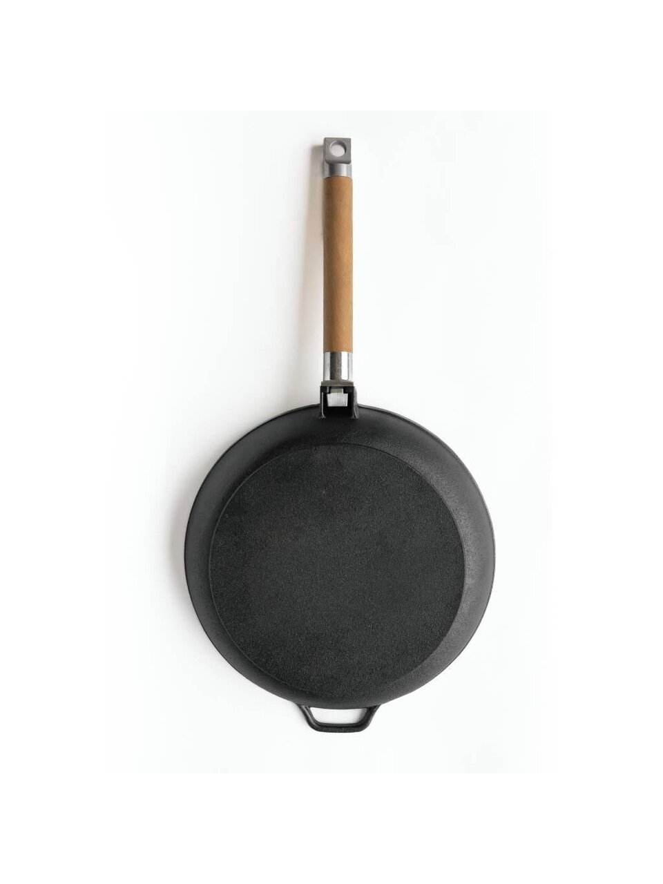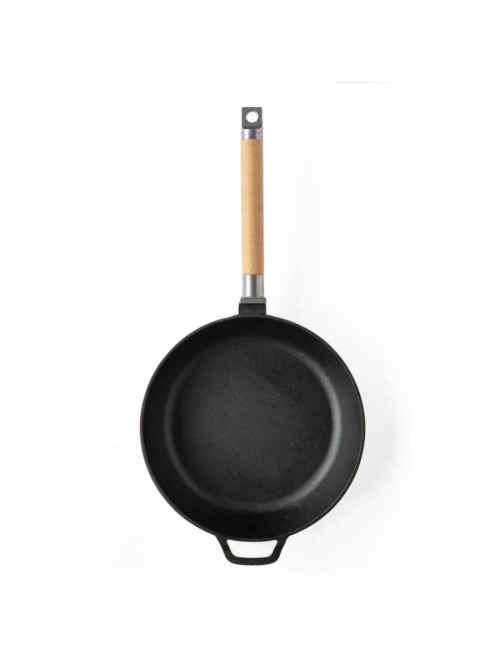 Чугунная сковорода Гардарика 26 см с высокой стенкой и съемной деревянной ручкой — идеальный выбор для жарки без ограничений: мясо, рыба, омлет. Совместима с индукцией.