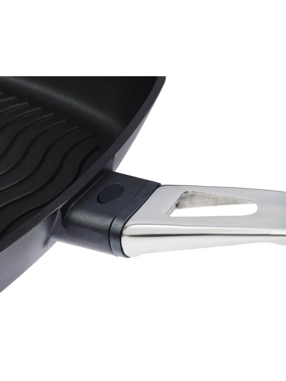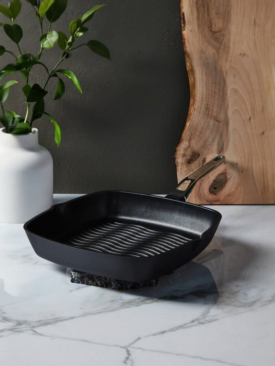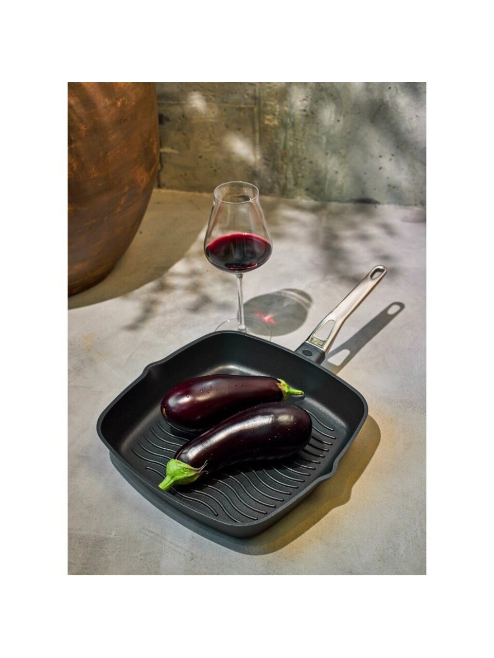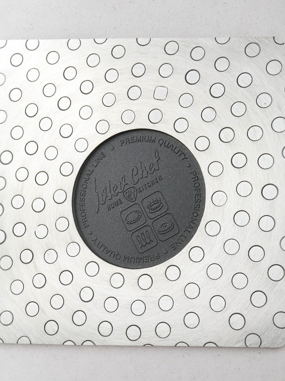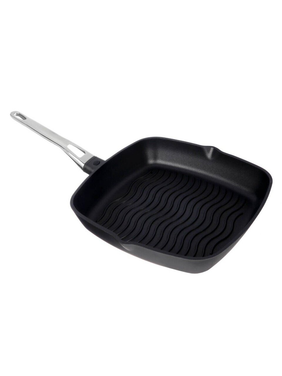 - Толстое дно 6 мм и литой алюминий обеспечивают равномерный нагрев, квадратная форма 28 см — больше места для продуктов.