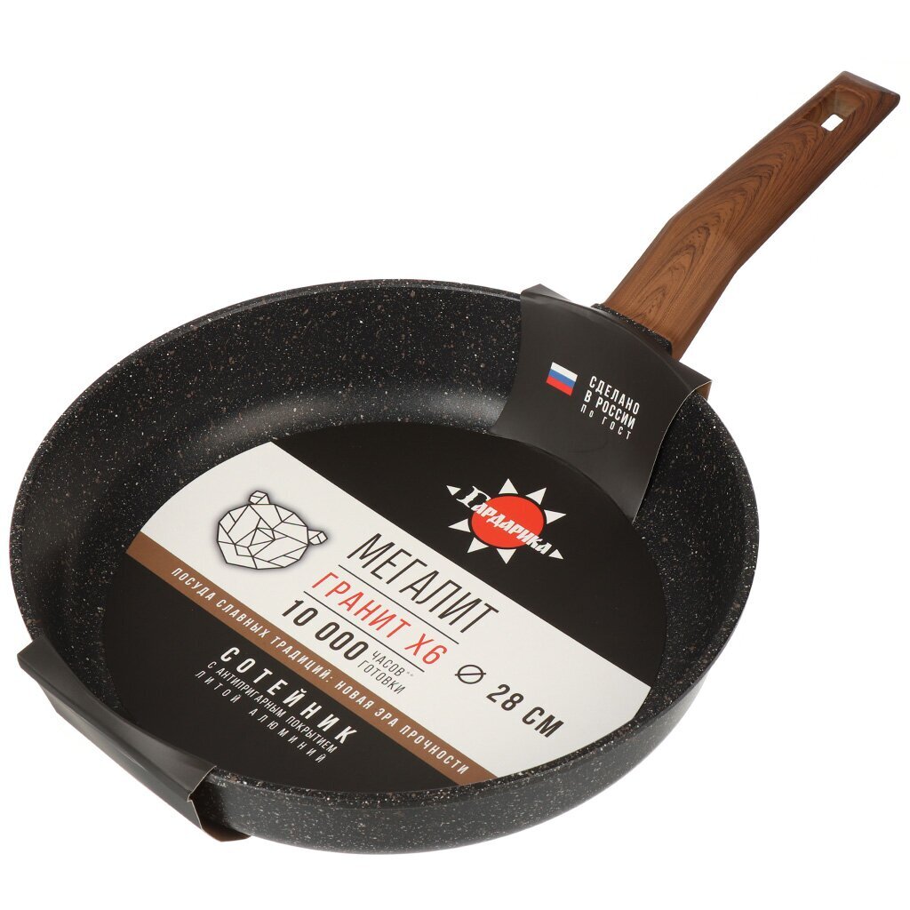 Сковорода Гардарика Мегалит 18, 28 см — литой алюминий, антипригарное гранитное покрытие, soft-touch ручка. Идеальный выбор для вкусных блюд дома и на даче.
