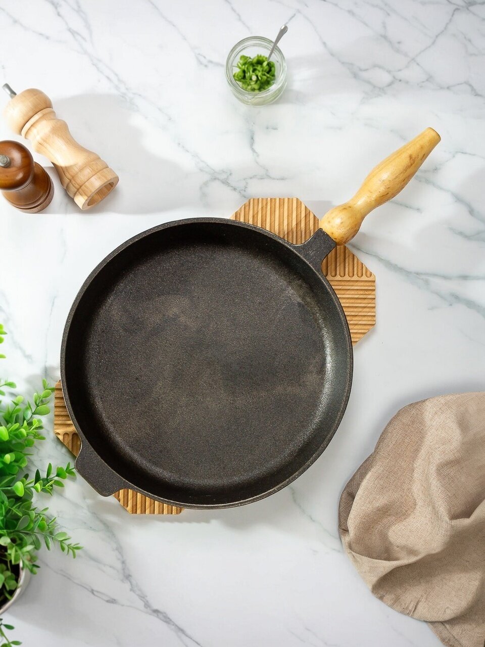 - Чугун 4 мм, диаметр 28 см — равномерный нагрев, прочность и срок службы до 36 месяцев по гарантии