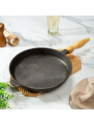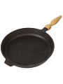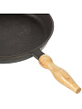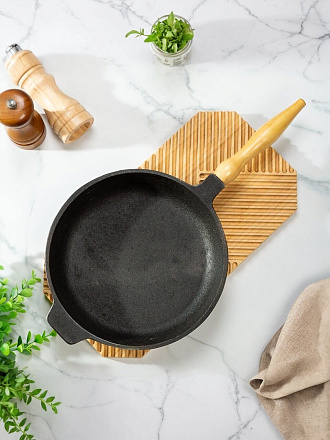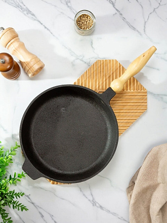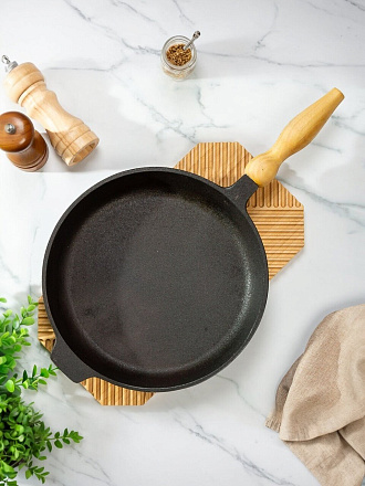 Сковорода чугунная 28 см DavrMetall с деревянной съемной ручкой: идеальный выбор для мяса, рыбы и завтраков на индукции. Служит десятилетиями, подходит для дачи и дома.