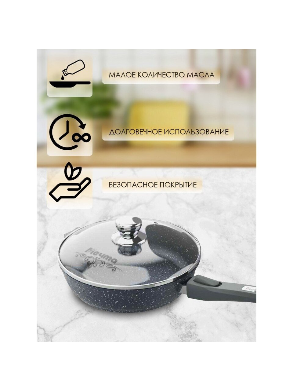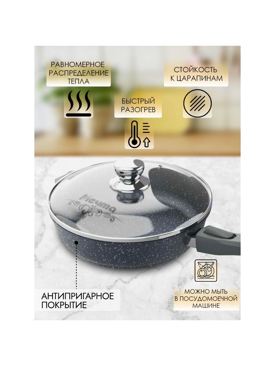 Сковорода Мечта Гранит black — оптимальный выбор для тех, кто ищет, какую сковороду выбрать для ежедневного и интенсивного использования. Благодаря литому алюминию и гранитному антипригарному покрытию блюда не пригорают, а равномерное распределение тепла сокращает время приготовления. Если вы спрашиваете, чем отличается эта модель от обычных сковородок, — здесь нет риска деформации, ручка снимается для запекания в духовке, а крышка удерживает сочность блюд.