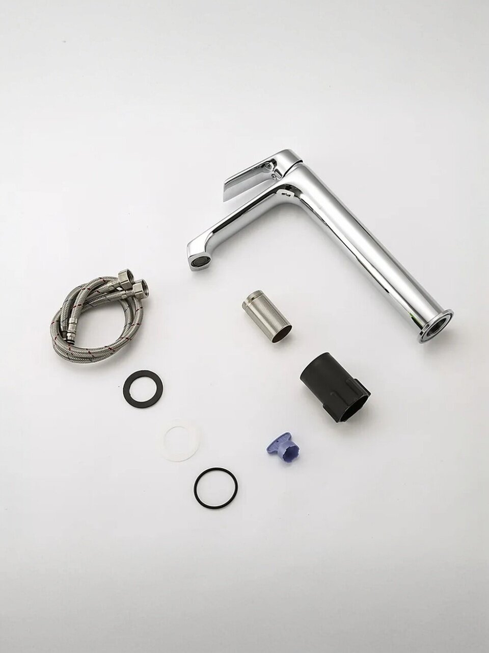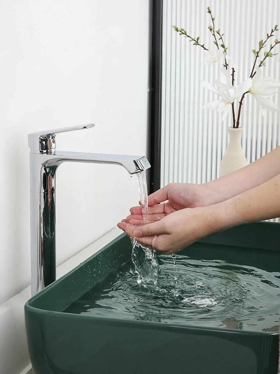 В отличие от аналогов с пластиковым корпусом, этот смеситель надёжнее и выглядит дороже. Он не требует сложного ухода: глянцевая серебристая поверхность легко очищается, а встроенный аэратор экономит расход воды. Подходит ли для маленьких и средних раковин? Да, средний излив 16,5 см универсален для большинства стандартных умывальников. Как использовать смеситель для раковины на даче? Просто установите его в одно отверстие, подключите гибкую подводку — и пользуйтесь без лишних хлопот.