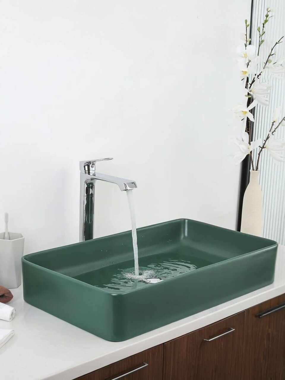 - Средний излив 24,7 см и глянцевая поверхность — удобно для раковин любых размеров