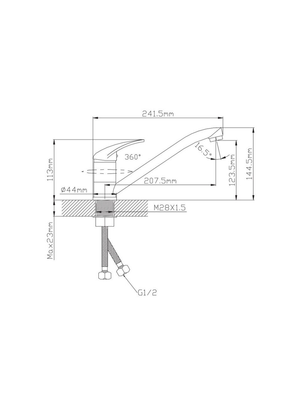 Для установки требуется одно отверстие диаметром 35 мм, стандарт подводки шланга — 1/2 дюйма. В комплекте — две гибкие подводки по 40 см, крепление на гайке.