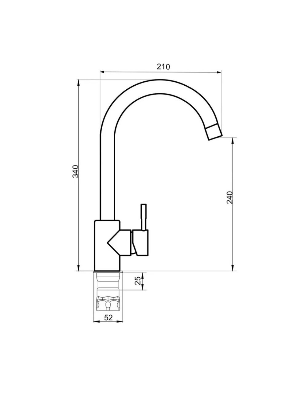 - Материал — нержавеющая сталь, поворотный излив 24 см, монтаж в одно отверстие диаметром 35 мм