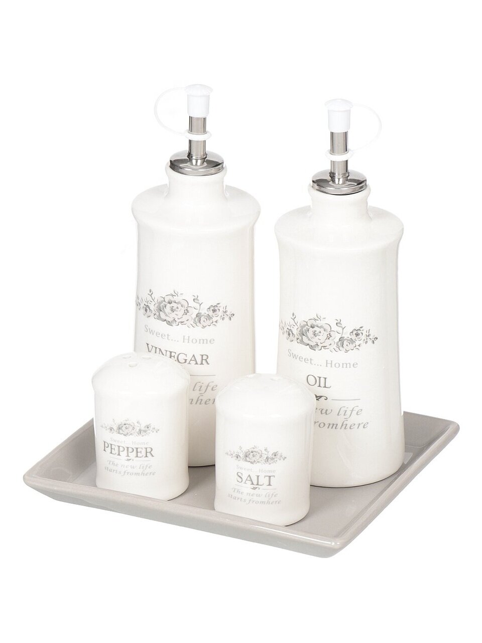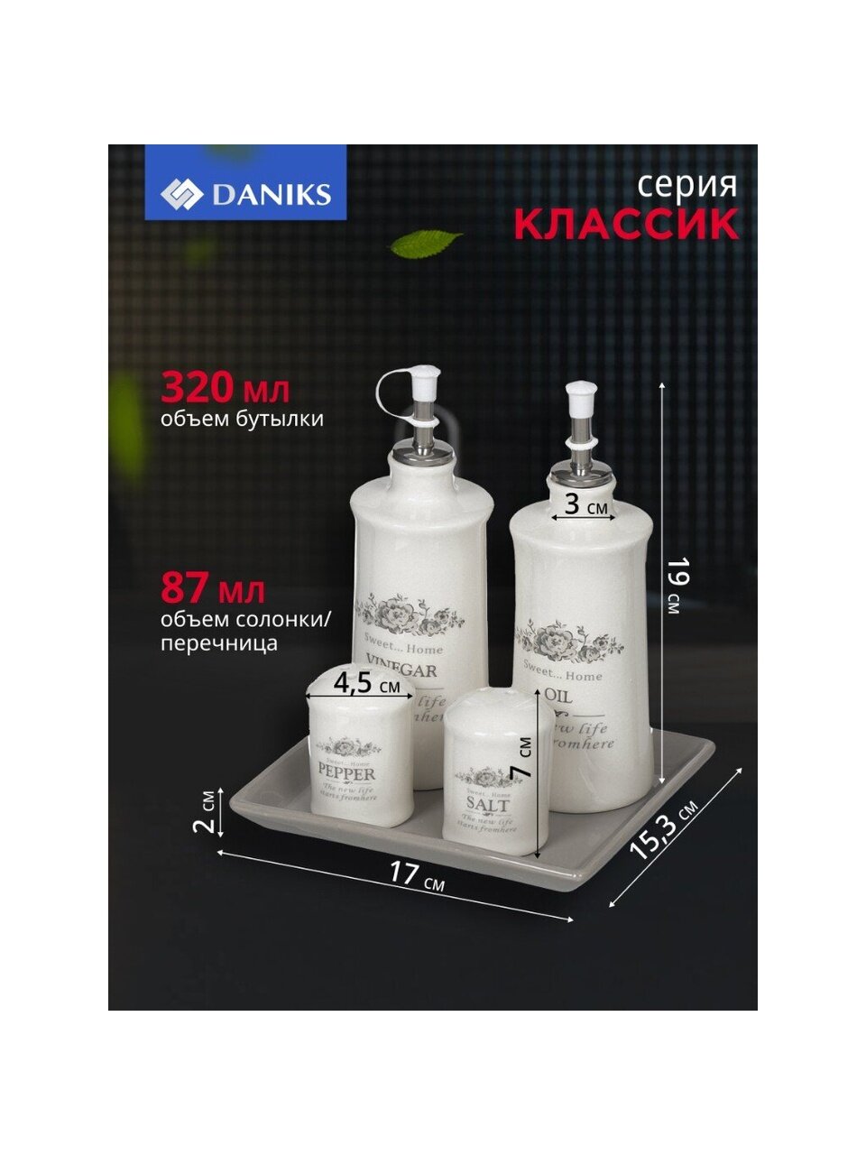 Набор для специй, масла и уксуса "Классик" на керамической подставке с ручкой состоит из 5-ти предметов: 2-х бутылок, солонки с перечницей и керамической подставки. Этот набор - прекрасный пример высококачественной, удобной и лаконичной посуды для изящной сервировки стола. Бутылки и емкости для специй выполнены из прочной керамики. Бутылки имеют металлические наконечники с пластиковыми крышками. Наполнить емкости для специй можно через отверстие в донышке, которое надежно закрывается пластиковой пробкой.